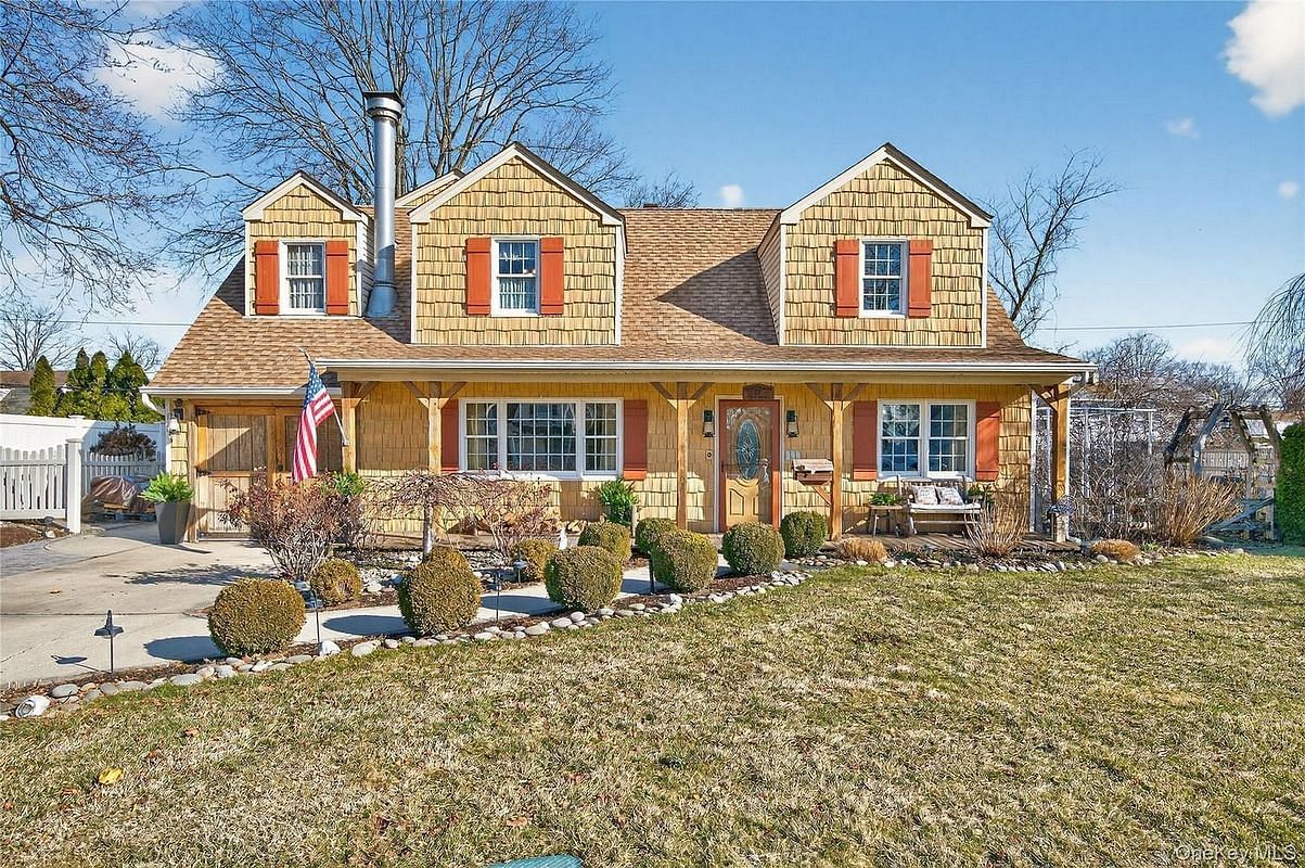 This charming home, with a flexible floorplan and wonderful landscaped property, is nestled in a neighborhood setting in Westbury. The entry front porch opens to the formal living room with stone fireplace, built-in book shelves and large window that floods the room with light. The heart of the home is the expansive renovated eat-in kitchen with wall of glass that overlooks the private, fenced property. There are granite counters, gas range with double oven, French door refrigerator, island, recessed lighting, door to garage and rear property and huge eat-in area. There is also the entrance to the three season porch that is the perfect place to relax and enjoy some peace and quite time. This room has sliders to the rear property with paver patio, sheds, extensive herb garden and a separate area that features a firepit. There is also a den on this level as well as a bedroom/home office. If you need more bedrooms, you have it! Or you can accommodate home offices too. On the second level there is a primary suite with sitting area, walk-in closet and king sized bedroom. There are three additional bedrooms a full bath with jetted tub, laundry closet and pull down stairs to access to the attic. The gardens burst with color from early spring on through the summer and into the fall. You are surrounded by nature at it's best. Addition features include: Five year old appliances, wainscotting, luxury vinyl flooring, hardwood flooring, carpeting, alarm system, 2003 windows & Roof, in ground sprinklers, firepit. CAC, pantry closet and great storage closets. This home comes with solar panels that are paid off!! A delightful place to call home! AND you are close to everything central Nassau has to offer! THE SQUARE FOOTAGE IS APPROX.