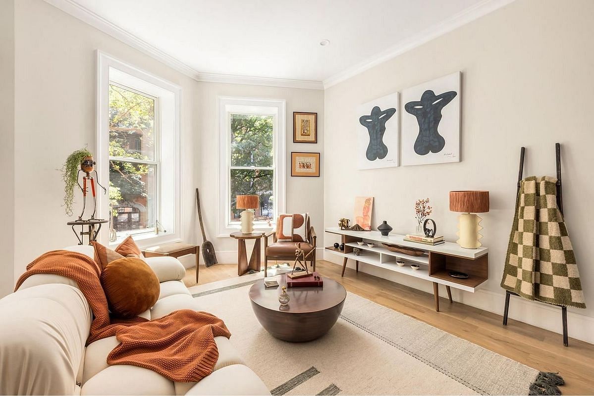 Residence Two is an expansive two-bedroom, two-bath home that unfolds across a single level with soaring ceilings and rich hardwood flooring that adds warmth and refinement throughout. As you enter, you are greeted by a magnificent great room that seamlessly combines living and dining in one sweeping, light-filled space. Framed by oversized windows, the room boasts a gracious, open layout, lovely architectural details, and enchanting views into the lush tree tops in the central Park Slope Historic District.