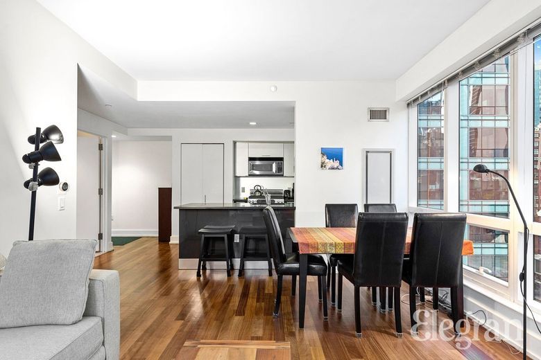 Sun-blasted corner 1 bedroom unit in the Orion Condominium on West 42nd street. Apartment features floor-to-ceiling windows with open South and East views, providing tons of light. Open chefs kitchen with granite counter tops, stainless steel appliances. Bathroom features Waterworks fixtures and a Kohler soaking tub. The Orion is a premier full-service luxury condo in the heart of Midtown Manhattan. Residents enjoy 24 hour concierge and doorman service, on-site parking, two full floors of amenities with private residents lounges, screening room, terrace, 3 different sun decks, business center, and laundry. The La Palestra Health club features 8,000+ sq ft of fitness center with swimming pool, whirlpool, and sauna on the 30th floor. You are steps from the Theater District and subway access to anywhere in Manhattan A/C/E, N/Q/R, 1/2/3, 7, B/D/F/M