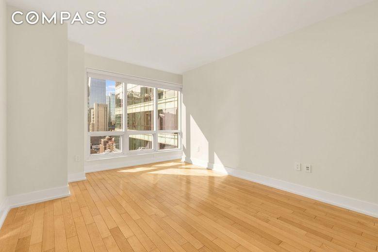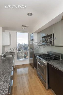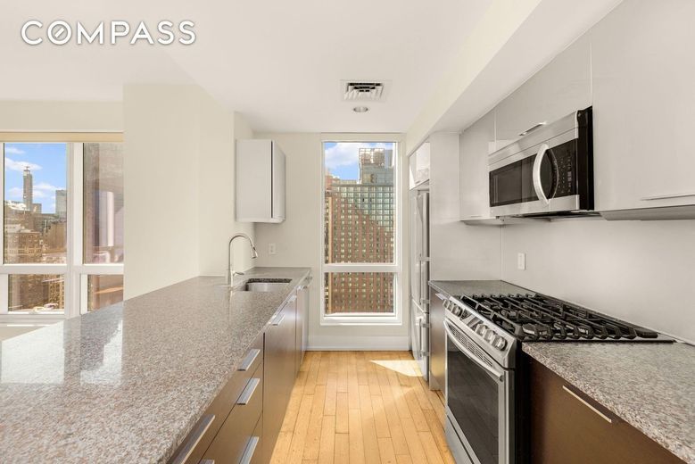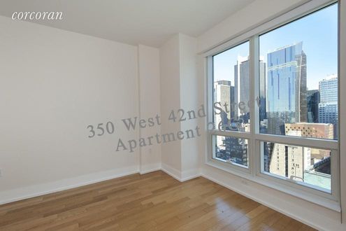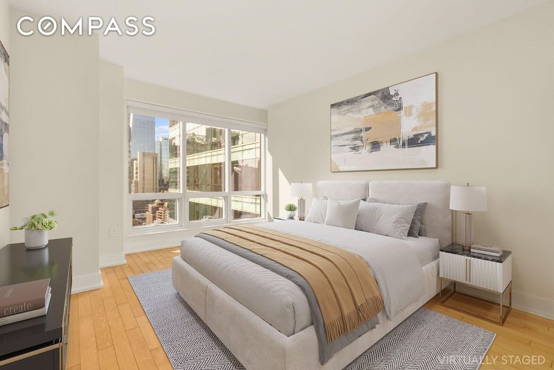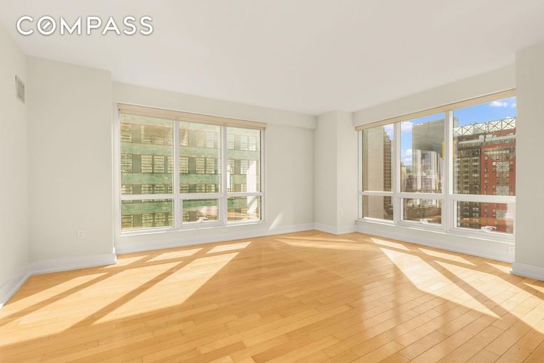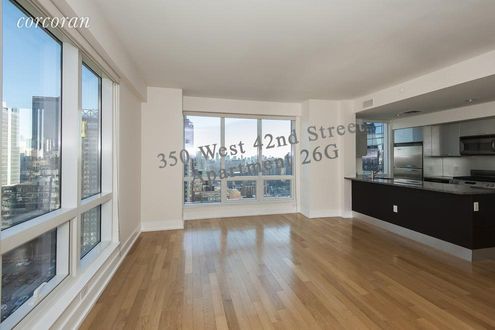Sun-blasted corner 2 bedroom condominium with 2 full baths perched on a southeast corner of the luxurious Orion condominium, 26 stories high above Hell's Kitchen. Stunning views of iconic New York City architecture. A welcoming entry foyer with large coat and storage closet leads to the open living area featuring floor to ceiling windows. The open kitchen with dining counter, dishwasher also has an oversized window letting sunlight pour in. The split bedroom and bath layout is wonderful for privacy. Both bedrooms have oversized closets with custom storage built-in, and both baths have deep soaking tubs.