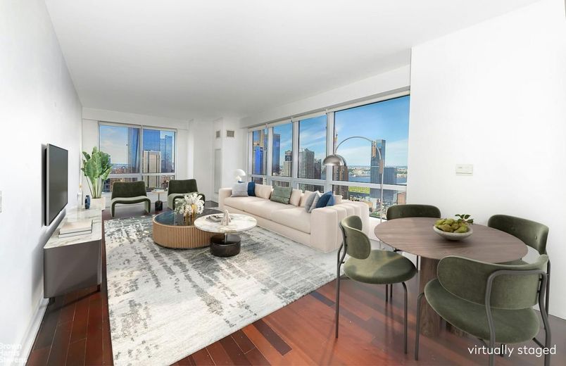 -Extra-large living room with views of iconic downtown including statue of liberty, One world trade, Hudson yards and the Hudson river.