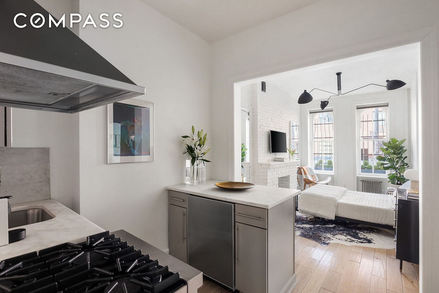 Located on the Parlor Floor of a boutique cooperative, features of the apartment include 10-foot high ceilings, exposed brick, oversized arched windows, a decorative fireplace mantel and refinished hardwood floors. Enter the home via a spacious foyer that leads to the entirely renovated marble kitchen featuring top-of-the-line appliances from Viking to Sub Zero and a marble eat-in island. The kitchen leads to the open-plan studio space, which allows for an abundance of space for living and sleeping areas. The apartment also features a fully renovated bath and a plethora of storage and closet space. All apartments in the building have through-wall PTAC air-conditioning and heating units with WiFi thermostats.