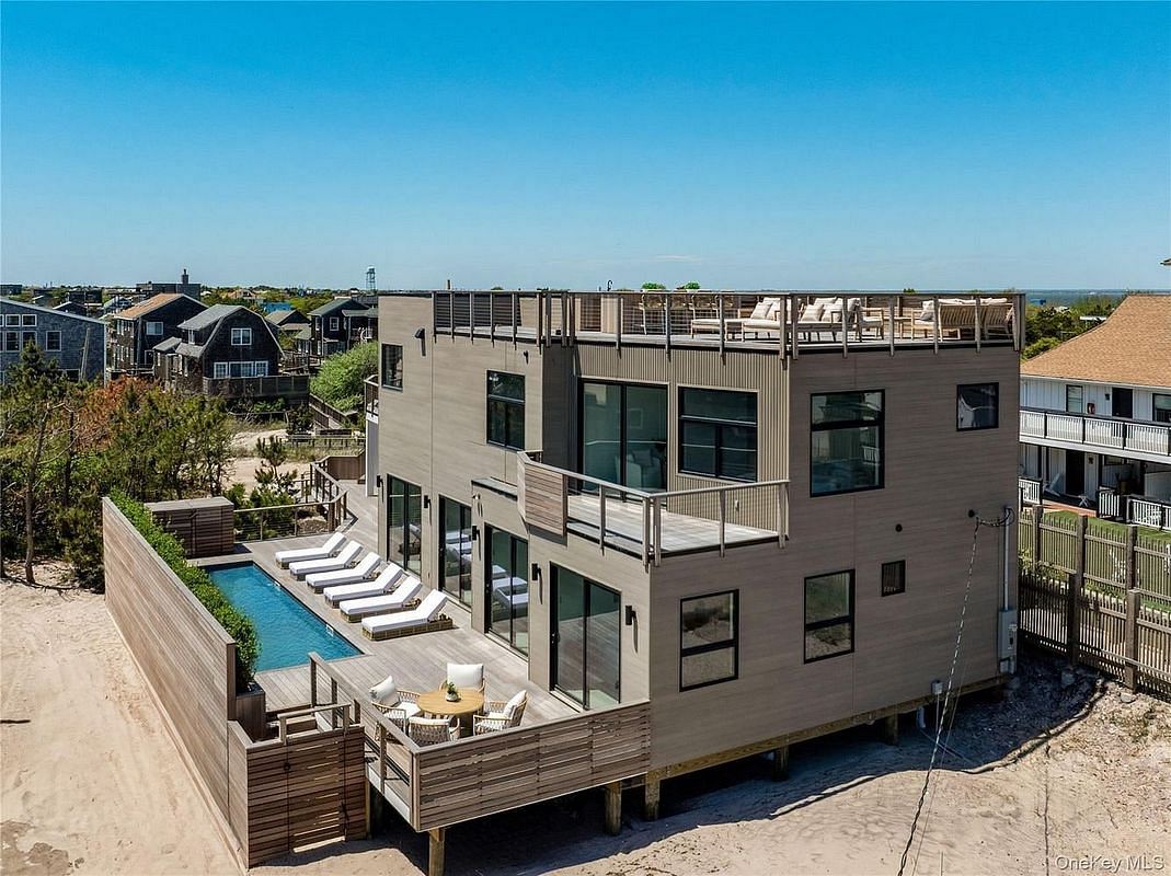 With multiple outdoor spaces to lounge and gather, when it comes to entertaining, there is no shortage of spaces in this home! Whether sunbathing by the pool or relaxing in the shade of the covered deck, the outdoor bar with fridge, sink, and ice maker is sure to come in handy. Just when you thought the views couldn't get any better, head up to the roof deck for a bird's eye view of the beach, bay, and the island. A spacious spot for entertaining, the roof deck comes complete with a massive wet bar, including refrigerator, ice maker, and seating for 8. Luxury appointments throughout include ceramic tile floors, Andersen windows, and zero maintenance New Tech siding.