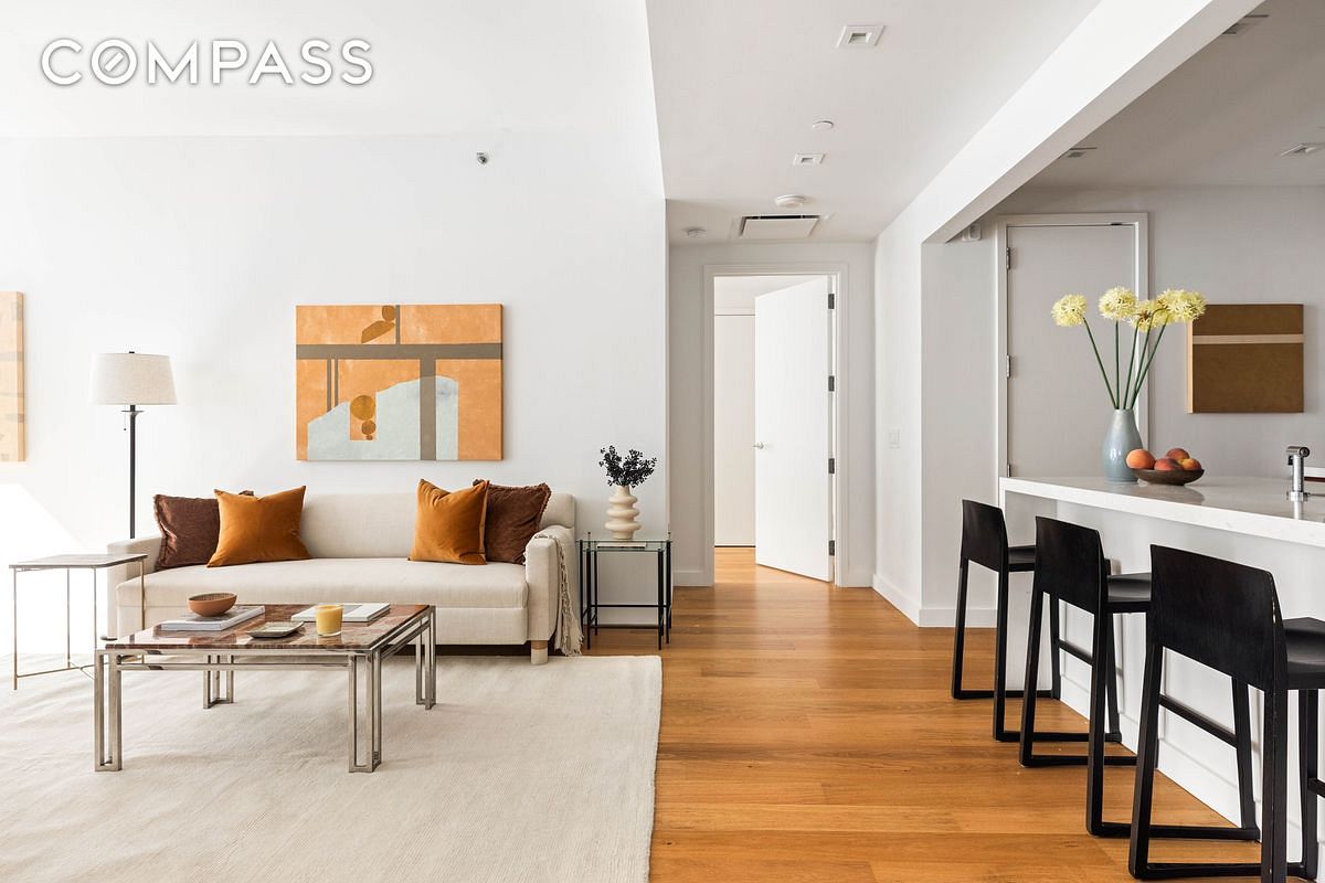 Welcome to this beautifully crafted 2-bedroom, 2-bath residence at Citizen360, a luxury condominium designed by SHoP Architects. Spanning 1,393 square feet, the home opens with a smoked walnut entry door and a white oak foyer, leading into an expansive layout with floor-to-ceiling windows, treetop views, and sun-filled eastern exposure. The split-bedroom floor plan offers optimal privacy, while white oak flooring throughout creates a warm, sophisticated backdrop.