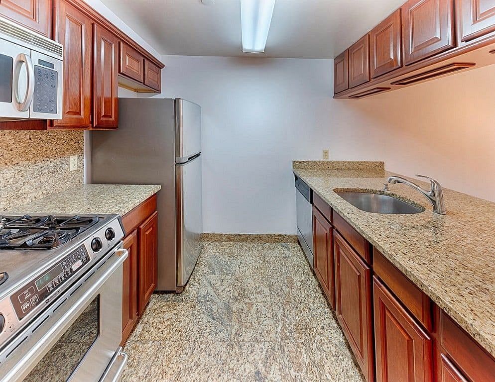 This modern contemporary designed kitchen feels like a California style kitchen without the aisle. There is a two seat granite dining counter with storage. It has beautiful wooden cabinets, stainless steel appliances that includes a microwave and dishwasher.