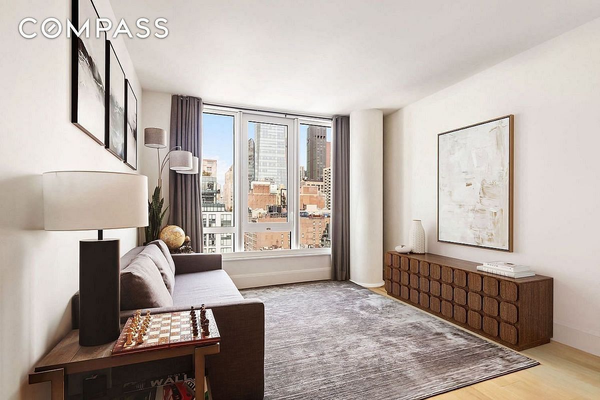 Residents enjoy a full floor of curated amenities including a fitness center, screening room, lounge, and rooftop terrace with panoramic views. The attended lobby, adorned with European white oak paneling and Palladium travertine floors, sets a refined tone from the moment you arrive.