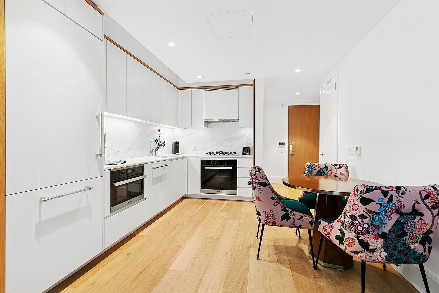 Expansive floor-to-ceiling windows that flood the home with natural light A sleek open kitchen featuring custom millwork, polished quartz countertops, and premium Fisher & Paykel appliances A spa-inspired bathroom with marble finishes, brushed nickel fixtures, and radiant heated flooring Washer and dryer in unit combo, wide-plank white oak flooring, and central A/C for maximum comfort Residence 5E is a quiet, stylish escape in the heart of the city. Its layout maximizes space and offers a refined, minimalist aesthetic.