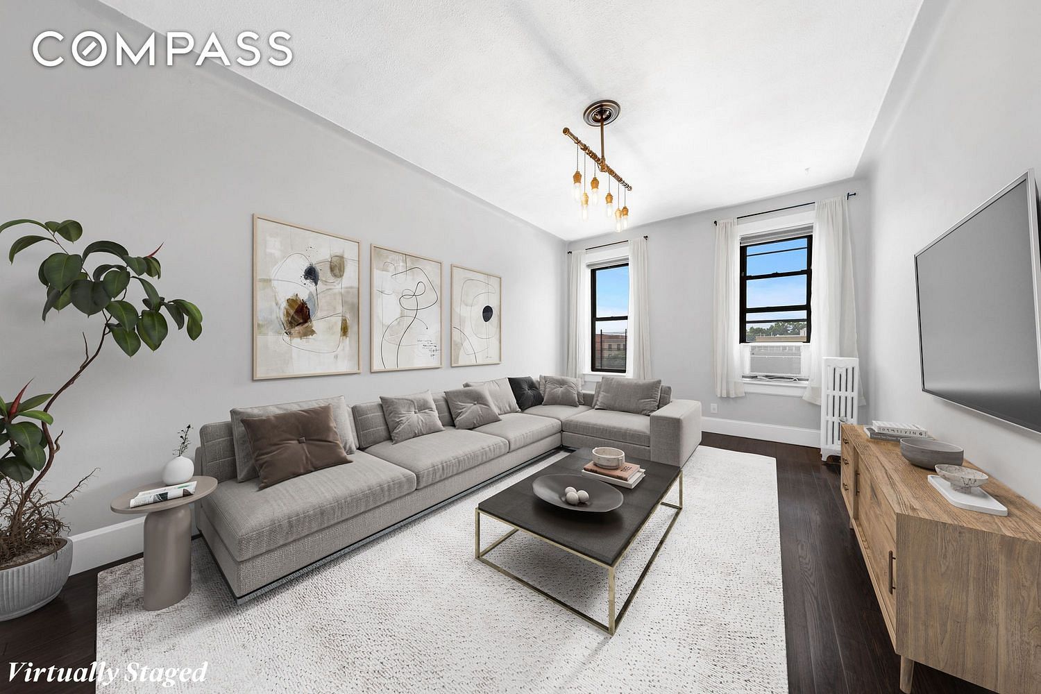 Welcome to Residence 6J, a bright and thoughtfully laid-out one-bedroom home perched on the top floor of a well-maintained elevator building. With western exposure, the apartment enjoys incredible natural light and open views safeguarded by the Jackson Heights Historic District. The living room is generously sized and easily accommodates both a work-from-home setup and a large L-shaped sofa, while the windowed eat-in kitchen provides ample storage and space for dining. The windowed bathroom enhances the home's airy feel, and the bedroom features a custom wardrobe storage system. Updated dark-stained hardwood floors run throughout, adding warmth and continuity.