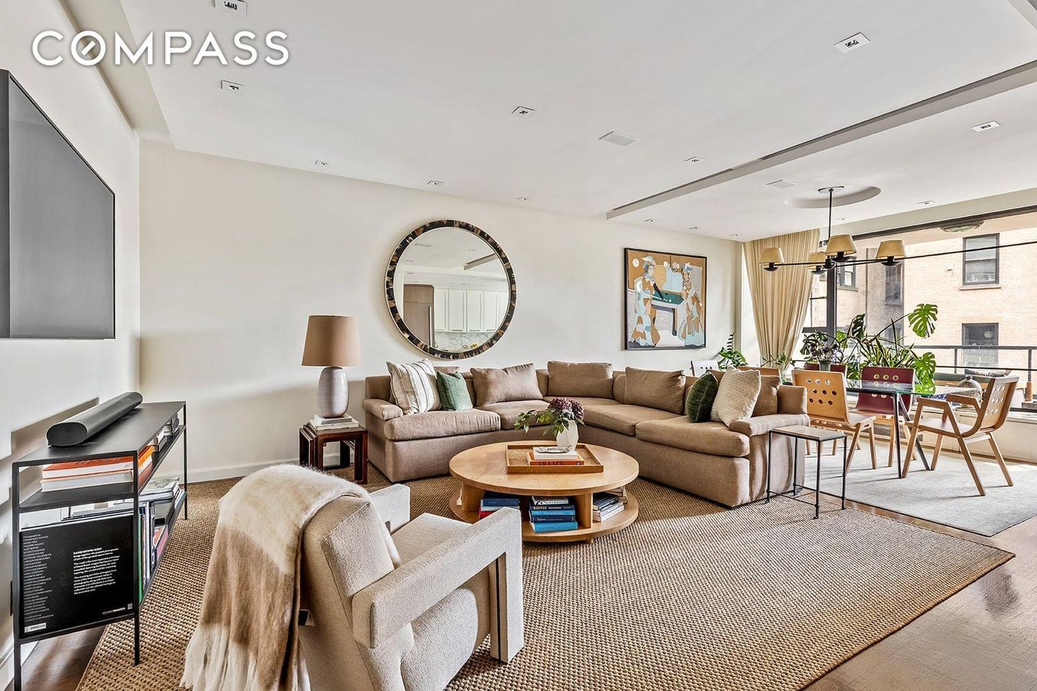 The reimagined layout blends modern luxury with timeless elegance. A gracious foyer with custom floor-to-ceiling closets leads to a spacious, light-filled living and dining area. Floor-to-ceiling south-facing windows open to a private terrace overlooking the buildings tranquil landmarked gardens and protected Greenwich Village views.