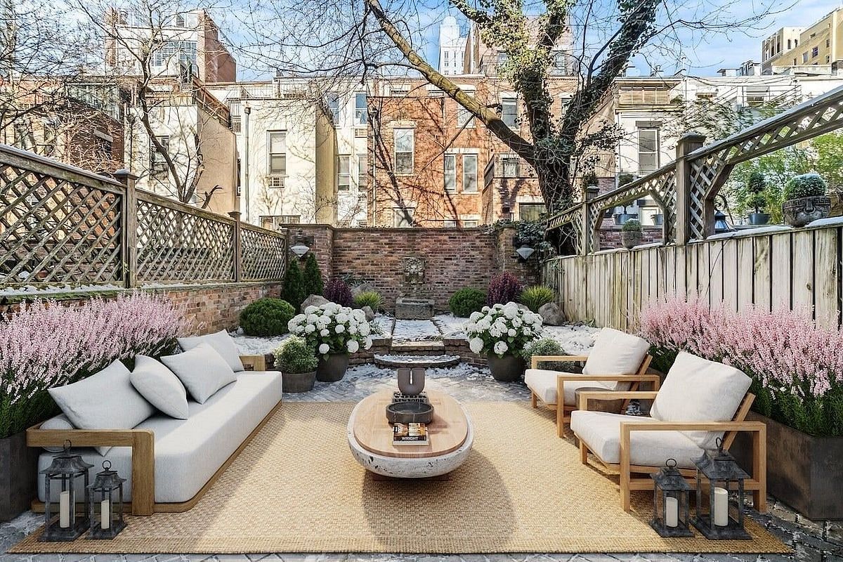 Enter the garden level, where an inviting open layout awaits. The family room seamlessly merges with the dining area, leading to a modern kitchen equipped with Miele, Wolf, and Sub-Zero appliances. French doors unveil a picturesque garden with fruit trees and a soothing fountain, perfect for outdoor gatherings. A side entrance under the stoop adds convenience with extra storage, blending functionality with inviting aesthetics.