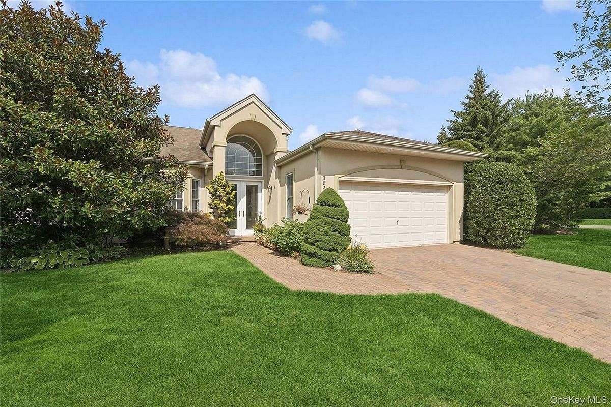 Beautifully updated, this "Valencia" ranch home epitomizes maintenance-free living in a 55+ luxury gated community with unparalleled amenities in The Greens at Half Hollow. Featuring a large foyer and a dramatic 2-story ceiling, this sophisticated retreat boasts a bright and airy great room with a multi-tiered tray ceiling and a floor-to-ceiling Palladian window that frames verdant views and gorgeous hardwood floors throughout the main living areas. The stunning kitchen is open to the living and dining areas and is outfitted with custom cabinetry, granite counters, stainless-steel appliances, ample storage, and a center island with seating. A comfortable den/library is adjacent to the kitchen, and there is an additional large bedroom with a double closet, which is ideal as a home office. The serene master suite offers a spacious bedroom with a tray ceiling, access to the patio, generous walk-in closet with an extra closet, and a spa-like master bath with dual vanities, sizable shower, tub, and a linen closet. A patio off the main living area is perfect for alfresco entertaining. Property highlights include incredible architectural details and hardwood flooring throughout the main living areas, designer fixtures and fittings, 2-zone HVAC, and a 2-car garage.