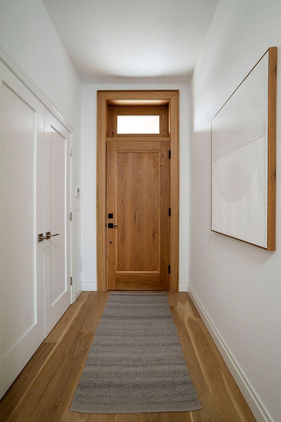 Interiors are grounded in warmth and functionality, featuring 6 solid white oak flooring, shaker-paneled doors, and oversized Pella Lifestyle casement windows that invite natural light throughout. The beautifully designed kitchen is custom-crafted with tall white oak and dove-white painted cabinetry, honed Taj Mahal quartzite countertops and backsplash, ample storage, a Bertazzoni direct-vent gas range and a fully integrated Bosch appliance suite. The spa-like windowed bathrooms feature custom white oak vanities, honed Calcutta Viola countertops, brass and satin black fixtures and radiant heated floors.