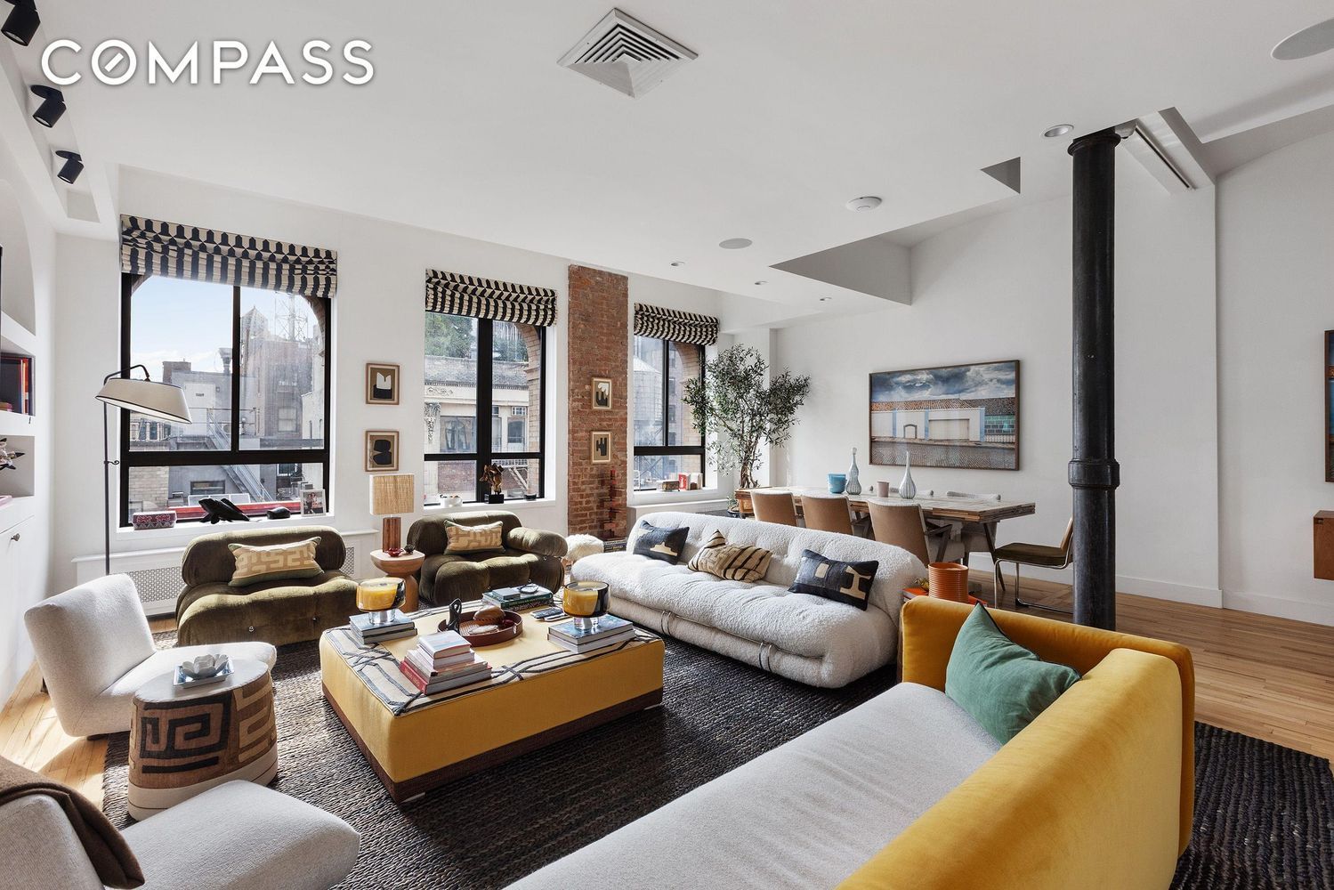 The sprawling main level living area is flooded with natural light through three oversized south-facing windows and multiple skylights. Original details include arched windows, cast-iron columns, and ceiling heights up to 17-feet. The renovated open chefs kitchen is equipped with high-end appliances and finishes, including Piatto Black Caesarstone countertops, a Miele dishwasher and gas range, Wolf microwave, Sub-Zero refrigerator, and a wine refrigerator. The luxurious primary bedroom is complete with custom closets, a skylight, and an en-suite bathroom outfitted with decorative tiles and a standup shower.