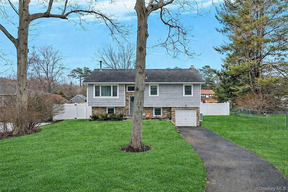 Incredible wide-line high ranch set mid-block on a perfect flat lot in the highly desirable Smithtown School District, showcasing exceptional curb appeal with beautiful vinyl siding and a cultured stone front facade that creates striking architectural presence. A paving stone front walk leads to a welcoming front porch that serves as the main entrance, complemented by a one-car attached garage for added convenience. The backyard is designed for entertaining with a large paver patio and a brand new wood deck with overhang, creating seamless indoor-outdoor living and ideal space for gatherings. Inside, the open-concept upper level features hardwood floors, recessed lighting throughout, custom crown and box molding, and abundant natural light throughout the formal living room, highlighted by a wood-burning stove with wood mantle and cultured stone wall that adds warmth and architectural detail, flowing effortlessly into the dining area and expansive eat-in chef's kitchen complete with white cabinetry, granite countertops, stainless steel appliances, stainless steel sink, white subway tile backsplash, generous cabinet and counter space, and a large center island, with a slider leading directly to the deck and yard. The second floor also features double plank wood flooring, enhancing the character and charm of the main living space. A beautifully updated second floor hallway bath with double sink, gray vanity, white countertops and tub with shower serves this level, along with a spacious primary suite with hardwood floors, crown molding and recessed lighting, plus two additional well-proportioned bedrooms. The lower level, with its own private entrance, offers remarkable versatility including an oversized living area ideal for extended family, guests, or a private home office, an additional spa-inspired full bath with oversized walk-in stand-up shower and custom tile inserts, mudroom and storage space, an additional home office with second sink and white cabinetry, 200-amp electrical service, and in-ground sprinklers, making this a complete, move-in ready home in one of Smithtown's most sought-after locations.