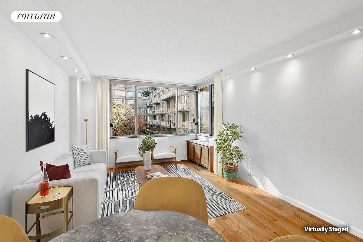 Residence 3HH at 393 West 49th St is a luminous one-bedroom corner apartment that offers views of the tranquil residents" courtyard and features a private balcony accessible from the bedroom. The unit boasts a fully renovated kitchen equipped with granite countertops, stainless steel appliances, ample cabinetry, and under-cabinet lighting. New hardwood flooring and recessed lighting enhance the space throughout. The bathroom has been entirely modernized with marble walls and flooring, a stylish vanity, and high-quality fixtures. HVAC units are discreetly concealed with custom wood covers. Residents enjoy the convenience of two laundry rooms on the same floor, along with a total of eight laundry facilities in the building, which also includes four rooftop decks, 24-hour concierge service, a doorman, and a resident manager.