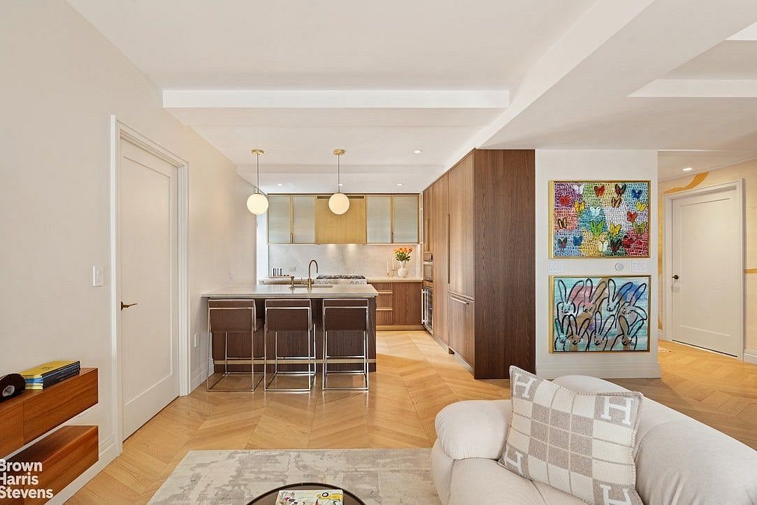 The entry foyer opens to a generous living and dining area flooded with morning light, with white oak chevron floors throughout. The open kitchen is outfitted with custom fluted glass and American walnut cabinetry, Naica Quartzite countertops and backsplash with a leathered finish, a full Miele appliance suite, and an InSinkErator garbage disposal. The corner primary bedroom suite occupies its own wing with a large walk-in closet and a luxurious en-suite bath finished in honed Pacific White Marble, featuring a custom white lacquer dual-vanity with Calacatta Black Marble countertop, a frameless glass walk-in shower, and heated floors. The secondary bath is finished with Corduroy Deco glazed ceramic wall tiles and Calacatta Gold Marble mosaic floors.