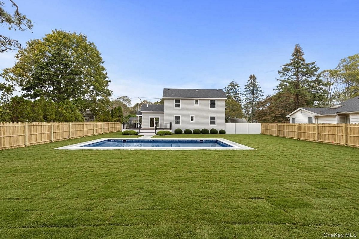 A stunning just-completed Hamptons home offering quality, design, and modern comfort. Reimagined from the ground up, this property blends craftsmanship, technology, and indoor-outdoor living at its best. The open-concept main level features high ceilings, hardwood floors, and a custom kitchen with a quartz waterfall island, sleek cabinetry, and smart appliances. The first-floor primary suite offers convenience and privacy, while every bedroom in the home is ensuite, each with its own beautifully finished bath. Glass railings, Anderson windows, and pre-stained cedar siding add to the home's bright and refined aesthetic. The finished lower level includes large egress windows, proper egress steps, a kitchenette, media/lounge area, and a bonus room ideal for a gym or office. Sliding doors open to a spacious deck overlooking the new heated pool and a flat ample, fully fenced yard with irrigation, sod, and Green Giants for privacy. Ideally located a short distance to good Ground Park and the Hampton Bays train station, and just moments from the future Hampton Bays Village, soon to undergo a major downtown revitalization bringing new shops, dining, and walkable amenities. Solidly built, beautifully finished, and move-in ready, the best value for a newly rebuilt Hamptons home with pool.