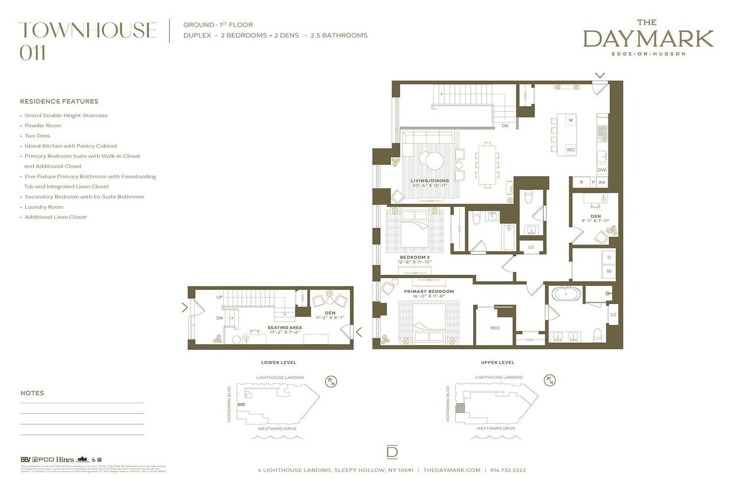 The Daymark brings luxury waterfront condominium living to the banks of the Hudson River in Sleepy Hollow, New York. Envisioned by architecture firm COOKFOX, The Daymark offers modern day comforts while harnessing the breathtaking beauty of its surroundings. Interior materials have been chosen to reflect the organic tones and textures of its waterfront setting. Our uncompromising commitment to quality extends into each uniquely designed residence with spacious open floor plans and crafted, quality materials. Fully-equipped kitchens offer state-of-the-art integrated appliances while bathrooms offer a private oasis clad in marble with floating tubs. The Daymark lifestyle extends beyond each residence with indoor/outdoor amenities including lobby with concierge, fitness center with yoga studio and swimming pool with stunning views. The indoor and outdoor amenity spaces have been thoughtfully curated to support life, work and a passion for healthy, balanced living. Additional Information: Amenities:Storage,