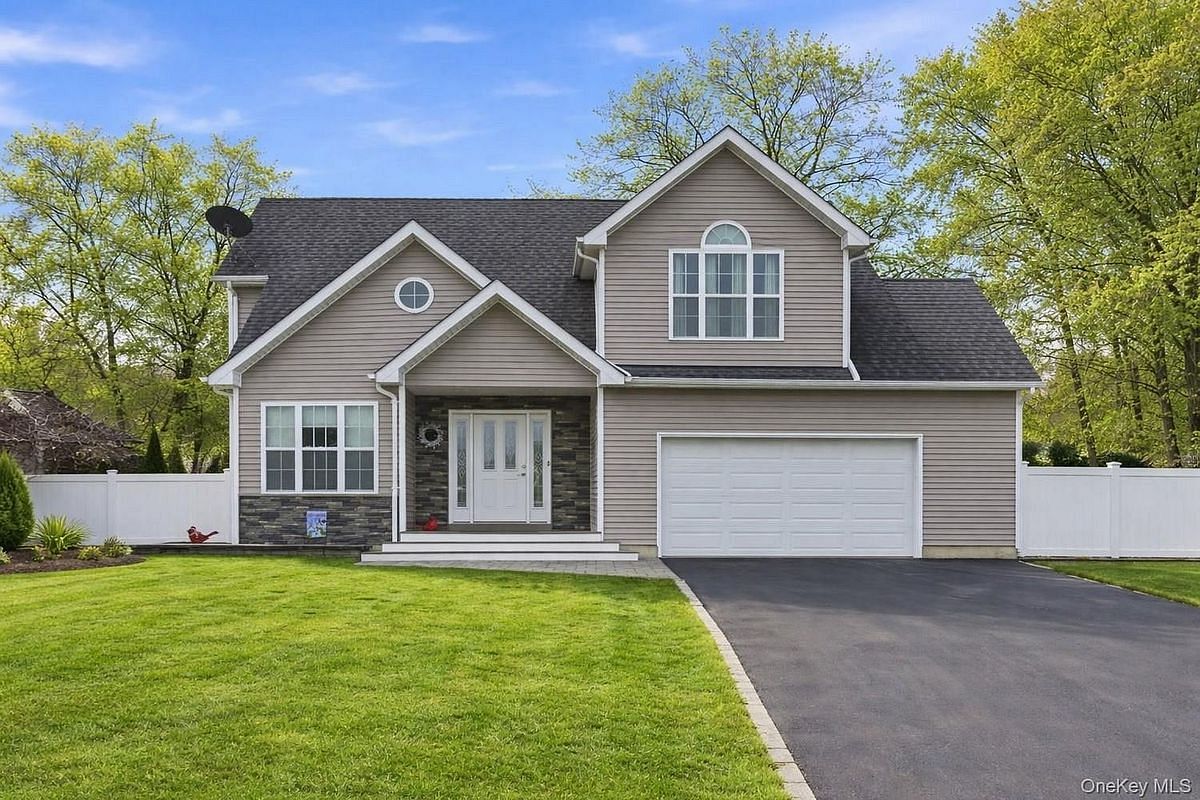 Move right in to this immaculate 3-bedroom, 2.5-bath Colonial set on a quiet cul-de-sac, conveniently located near shopping and major roadways in the Middle Country School District. The 1st floor features a spacious open floor plan with hardwood floors throughout, Front entry opens to a warm, welcoming living room that flows into a gourmet eat-in kitchen w/granite countertops and stainless steel appliances. A dedicated home office/den and powder room complete the main level. Upstairs features 3 spacious bedrooms with ample closets, including a large primary suite with hardwood floors, en-suite bath, and WIC. Second floor also has an add'l full bath as well as a laundry room with washer/dryer in hallway. The fully fenced backyard is beautifully landscaped and features a resort-style patio, perfect for entertaining. Additional features include an oversized attached one-car garage, full basement with outside entrance, in-ground sprinklers, central air, 200-amp electric, whole-house generator, security alarm system and sewer connection. Truly mint—just unpack and enjoy!