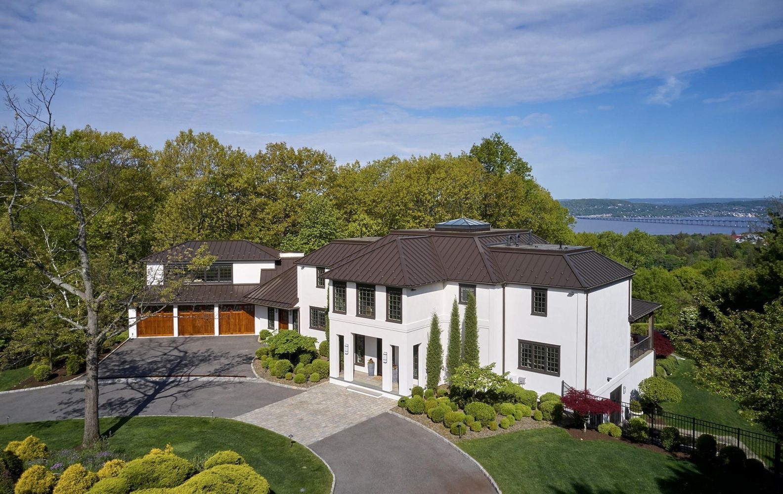 Breathtaking views of the river and Tappan Zee bridge are ever present in this hilltop home overlooking the Hudson. Majestic windows frame vistas and flood rooms with natural light, while doors to covered decks extend the boundaries of refined entertaining. Completely re-built in 2015 by an innovative investor as his own residence, this contemporary home is timeless and elegant, with loft like open floor plan, expansive home office and stylish primary bedroom suite. The first floor features a true chef's kitchen with stainless steel appliances, custom cabinetry, and center island that serve as a focal point for culinary creations and social gatherings. There are a total of 4 bedrooms on the second floor plus laundry, a first floor bedroom/office privately off the informal entrance to the home, and a guest bedroom with bath and laundry center in the lower level. An elevator conveniently services all three floors. Outdoors is an oasis with stunning, landscaped heated salt water pool and meticulously manicured grounds for a perfect blend of privacy and natural beauty. State-of-the art amenities throughout the home include 100% radiant heat flooring, aluminum standing seam roof, ecological spray foam insulation, Lutron smart home system, ceiling speakers indoors and out, elevator and three car garage. This rare example of contemporary architecture and design is just 30 miles from midtown Manhattan in the Rivertown village of Irvington-on-Hudson.