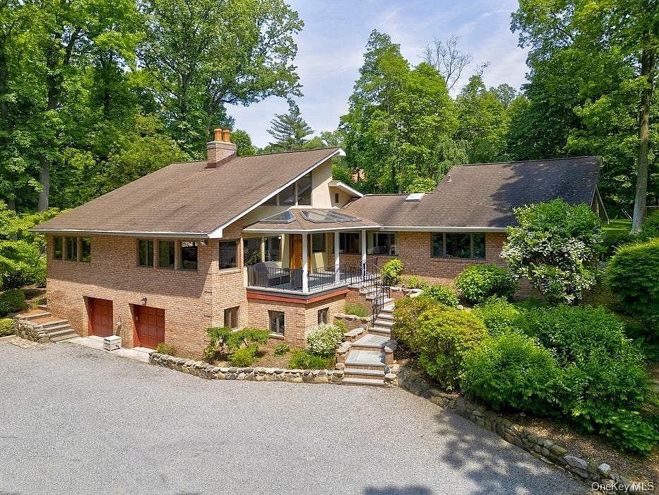 A sweeping driveway leads to an elevated front terrace surrounded by lush foliage, where seasonal glimpses of the Long Island Sound add to the home’s charm. Inside, all four bedrooms and four bathrooms are conveniently located on the main level, offering comfortable ranch-style living and effortless flow throughout.