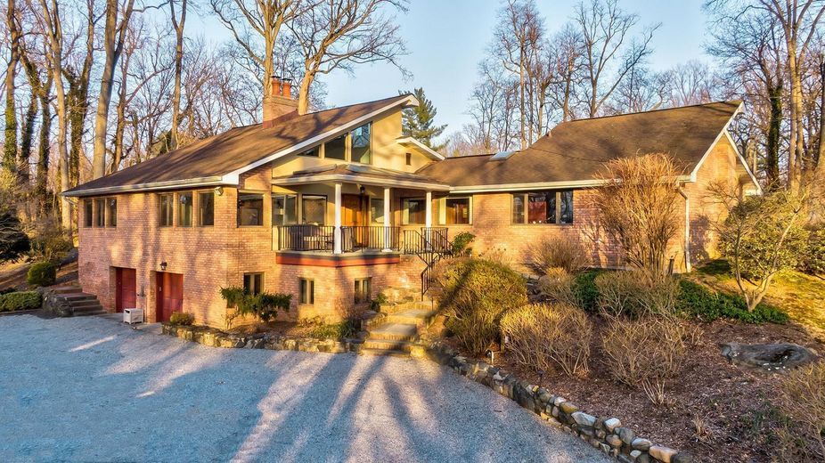 A sweeping driveway leads to an elevated front terrace surrounded by lush foliage, where seasonal glimpses of the Long Island Sound add to the home’s charm. Inside, all four bedrooms and four bathrooms are conveniently located on the main level, offering comfortable ranch-style living and effortless flow throughout.