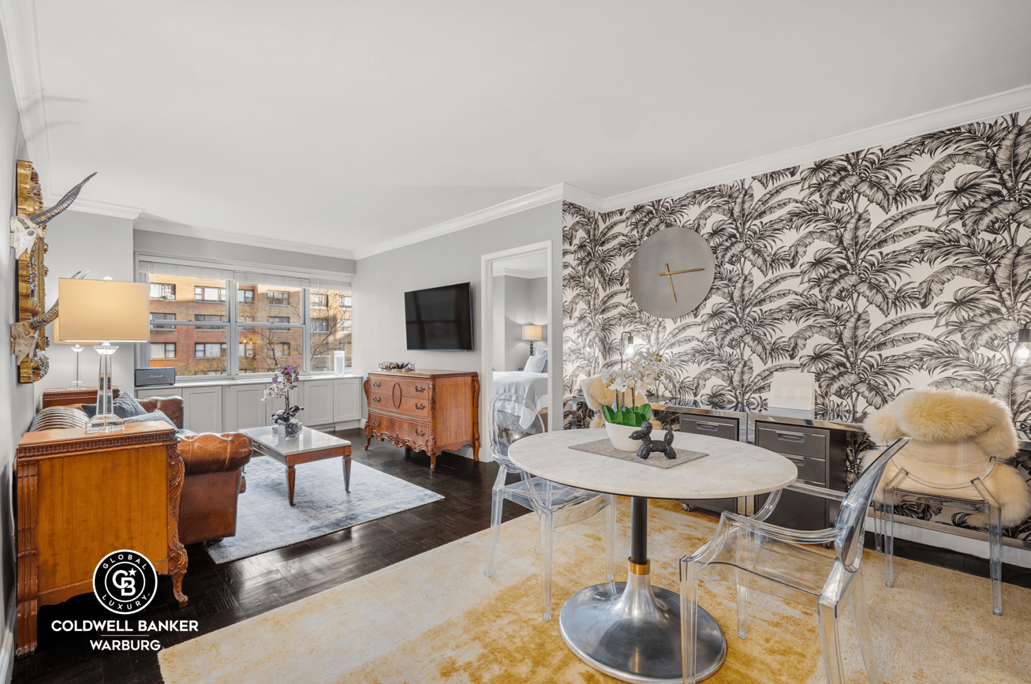 Apartment 6K at Plaza 400 is a spacious junior 1-bedroom, thoughtfully converted from a large studio. The layout offers distinct living areas, including a cozy work-from-home nook in the living room for productivity and comfort.