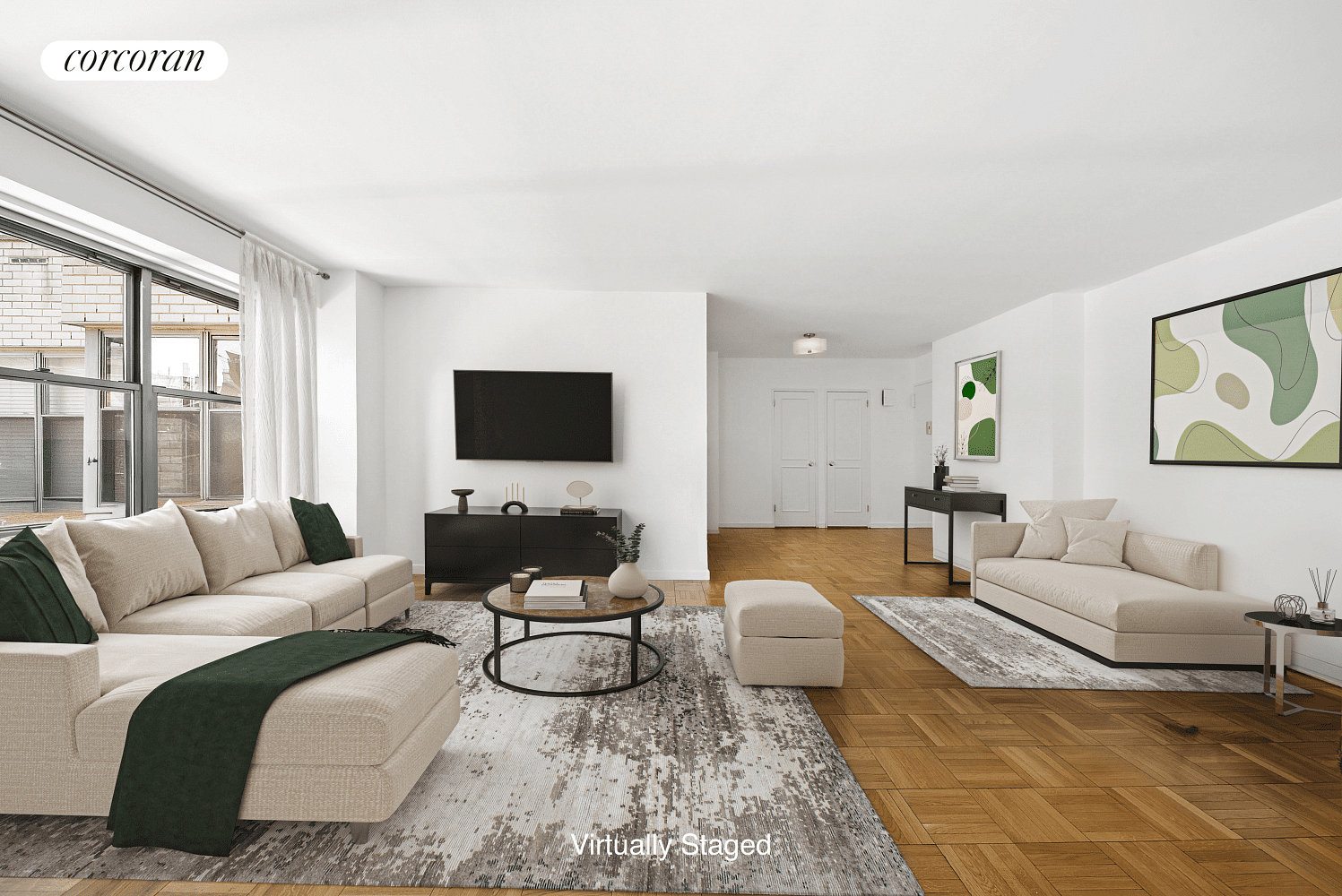 The oversized living room offers endless flexibility, with a wall of bright south-facing windows and more than enough space to accommodate a full dining area, a large living setup with sectional sofa, home office, and more.