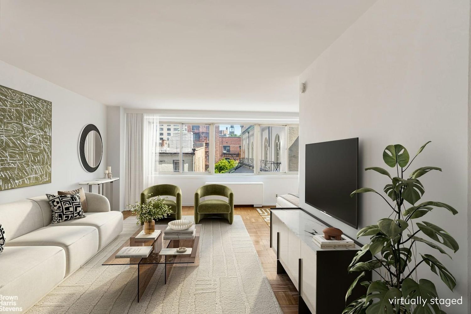 Step into a light, quiet, and freshly painted spacious alcove studio that can easily be converted to a 1 bedroom if desired! The full wall of windows offer a North and East exposure . The 27 foot living room has ample room to enjoy both your generous living space and a separate dining area. Storage will never be a problem with 3 large closets, one inside a large dressing room leading the the bathroom.