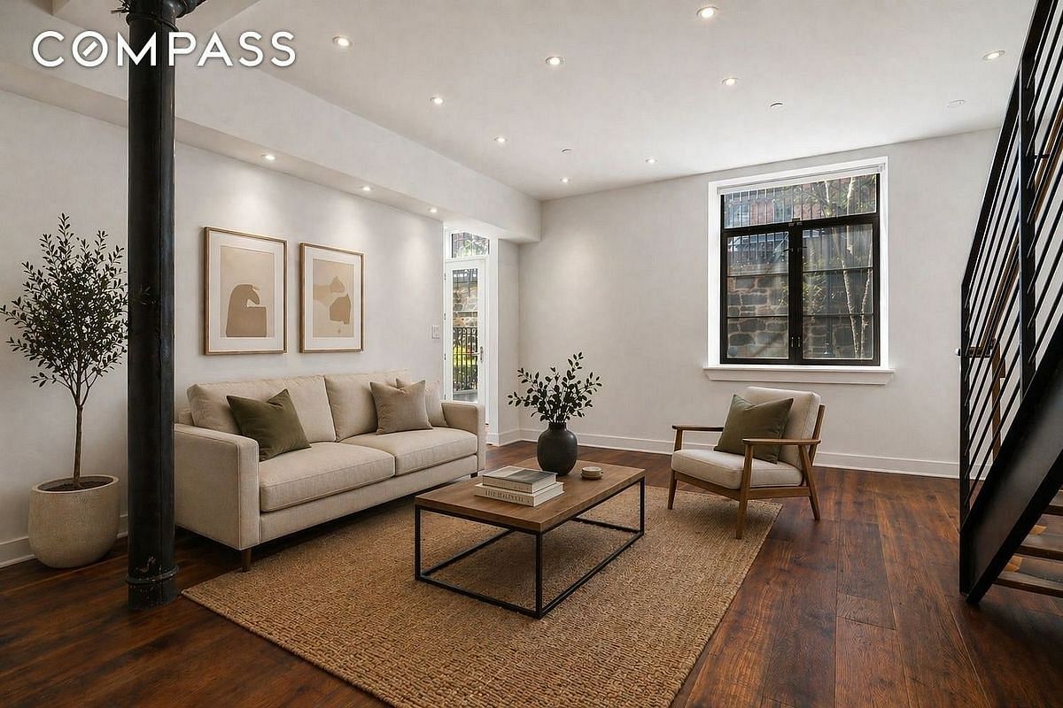 This approximately 1,452-square-foot duplex condo at The Arches at Cobble Hill offers the rare convenience of entry on both levels, with the lower-level entrance creating a private, townhouse-like feel, enhanced by charming flower beds just outside.