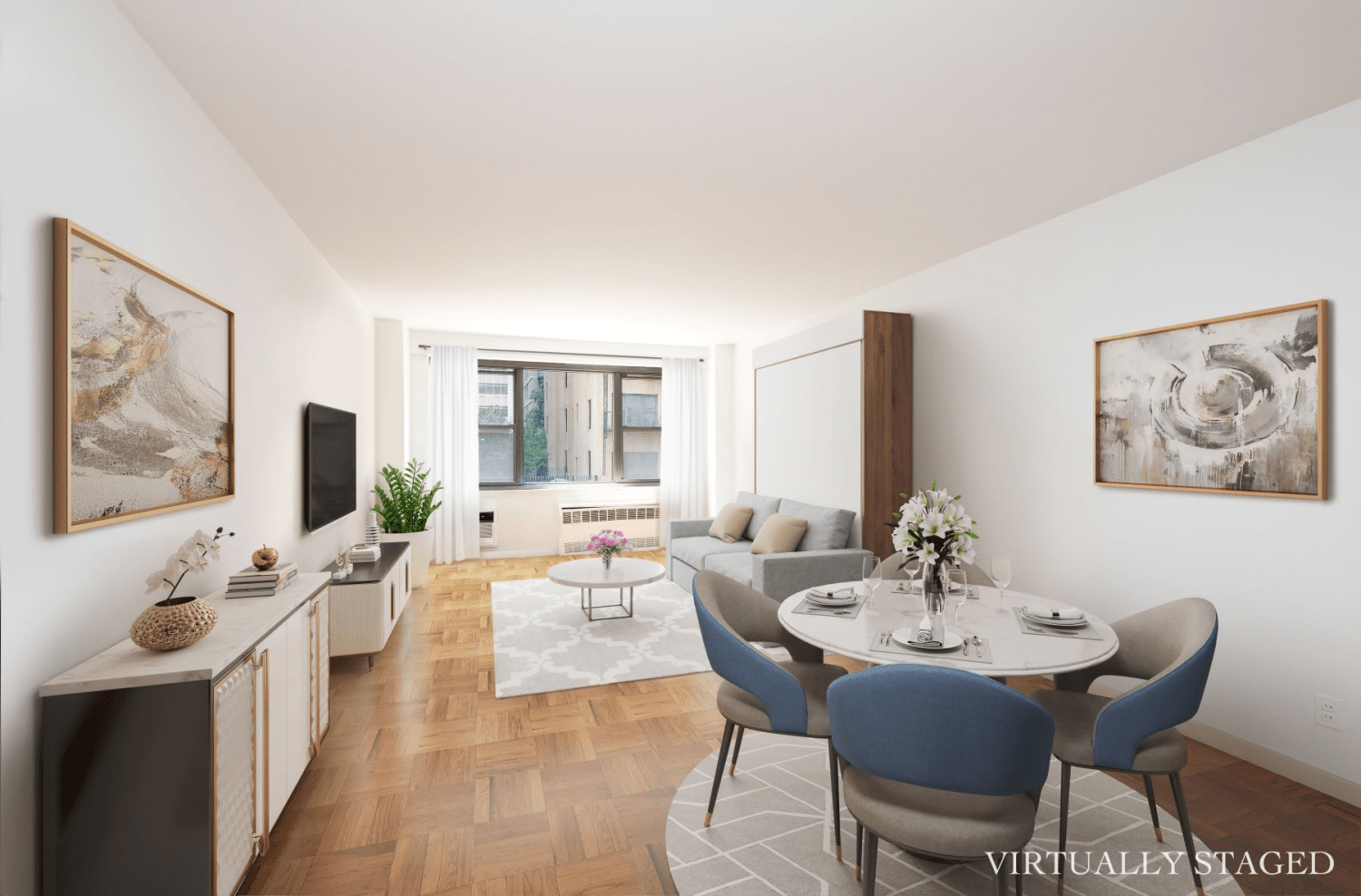This charming and tranquil studio apartment is bathed in natural southern light and offers a view of the Roosevelt Island Tram. The meticulously maintained home features a spacious living/dining area, a separate kitchen with ample cabinet space, three generous closets, and a custom-designed dressing area with additional storage.