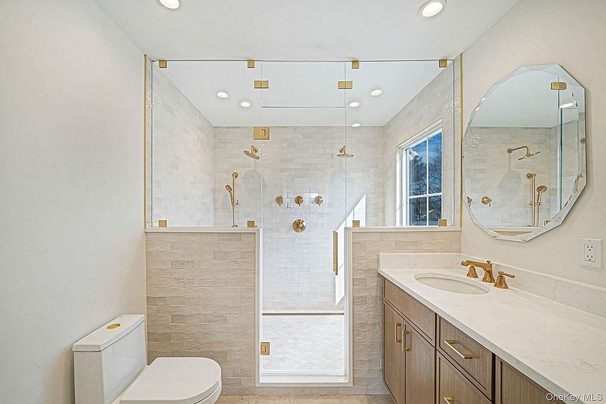 The primary suite is a private retreat, featuring balcony access overlooking Peconic Bay, a spa-like bath with dual rain shower heads, double sinks, and premium Kohler fixtures.