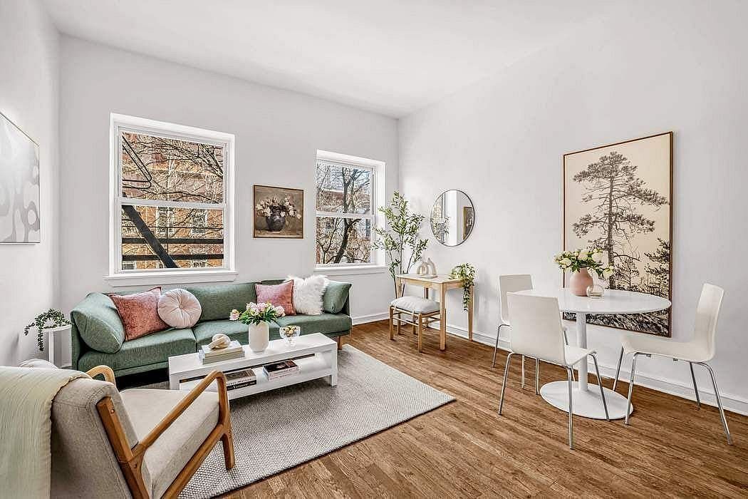 Located just two flights up in a charming pre-war walk-up, the apartment combines classic New York character with modern comforts.