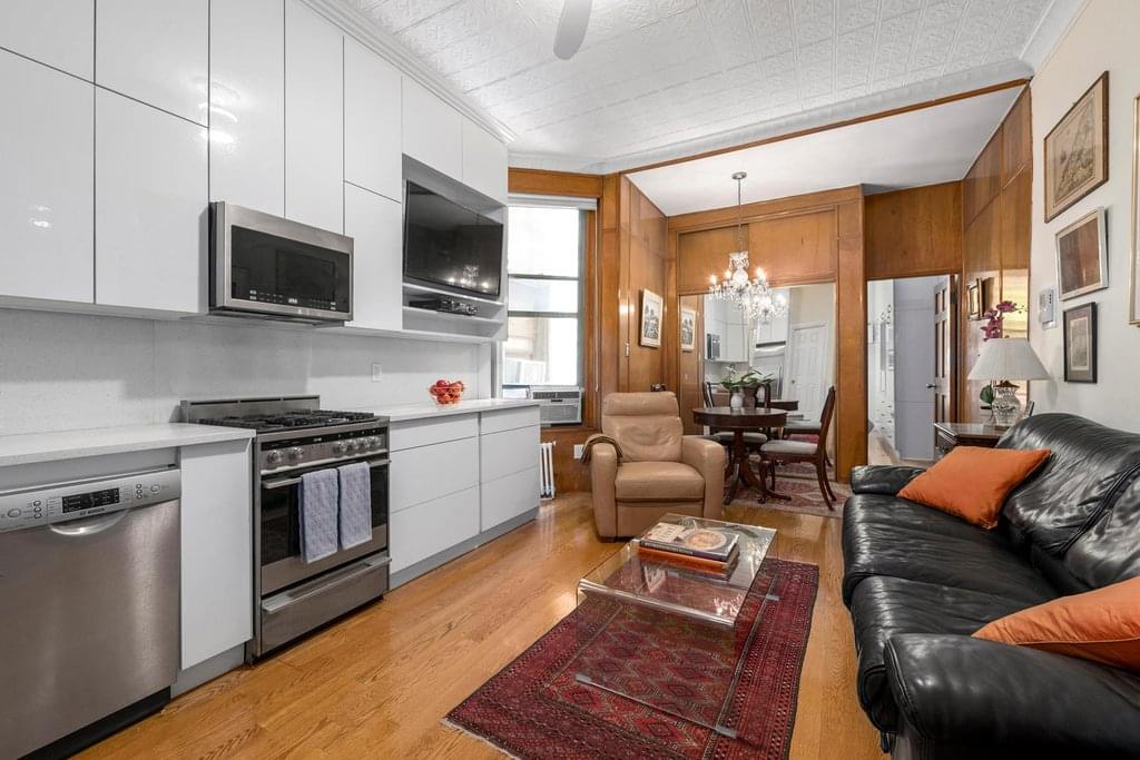 SIMPLY THE BEST one-of-a kind one bedroom with $250 maintenance. Twelve feet of ultra modern white floor to ceiling cabinets artfully enhance the creative renovation of the living and kitchen space. On the first floor with sunlight from the south, the raised first floor faces a wide open vista of greenery, flower gardens, sky, and a sunlit planted courtyard. Pin-drop quiet with no one below you for peaceful easy living. The impressive kitchen with 10 feet of white quartz counters, tile backsplash, and stainless steel appliances including a Bosch dishwasher and Fisher Paykel range, make living in Manhattan possible. Open to the living room the wall of elegant cabinets holds a flat screen TV for your relaxing evenings. The dining area with additional nine foot tall pantry space is framed by wood paneling and a mirrored sliding pantry door. Your smartly designed bedroom has brand new modern white floor to ceiling cabinets for the most versatile space you can imagine, in addition to the 2 built-in 9 foot tall closets with mirrored doors. Truly room for everything. The quiet bedroom is flooded with light from a seven foot tall window and faces the gardened courtyard. Your unique fully renovated bathroom includes a Bosch washer and dryer, large windowed shower stall with shelves, and luxurious marble vanity. Tucked behind the shower stall is a petite and useful linen closet. One basement storage cage belongs to the apartment and there is room for a bike. Located in the enchanting theatre district called Clinton, you will find a plethora of markets, cafes, theatre hang-outs, coffee shops and more. An easy 3 blocks to the Hudson River Greenway with the dedicated bike path along the river and Pier 84's park and fountain. Public transportation from the A, C, E, W, R and 1 trains and the 42nd Street Port Authority Bus Terminal are a short distance away. This is a life-time home. Pets allowed. Primary residency required for one year and then unlimited subletting is permitted. Financially sound and self-managed. 10% flip tax on the profit.