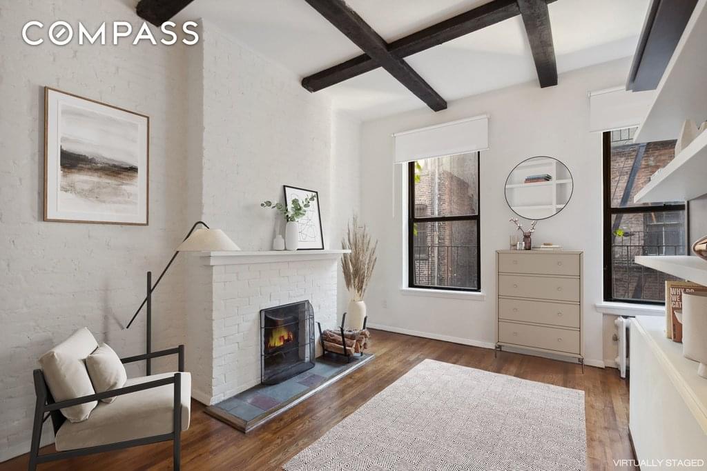 Dreaming of a quiet place to call your very own? This delightful oasis in the heart of the West Village is a pitch-perfect antidote to the stress of the city. Nestled just 3 flights up, this sweet sunny studio is adorned with exposed brick, high beamed ceilings, floor to ceiling bookshelves and a wood-burning fireplace! A custom Murphy Bed is the perfect addition to the space, functioning as a table or desk by day and a short queen-sized bed at night. The kitchen and bathroom are both in nice condition as well. Whether you are looking for your very first home with super LOW maintenance or a fabulous pied-a-terre, this gem is ready for you.