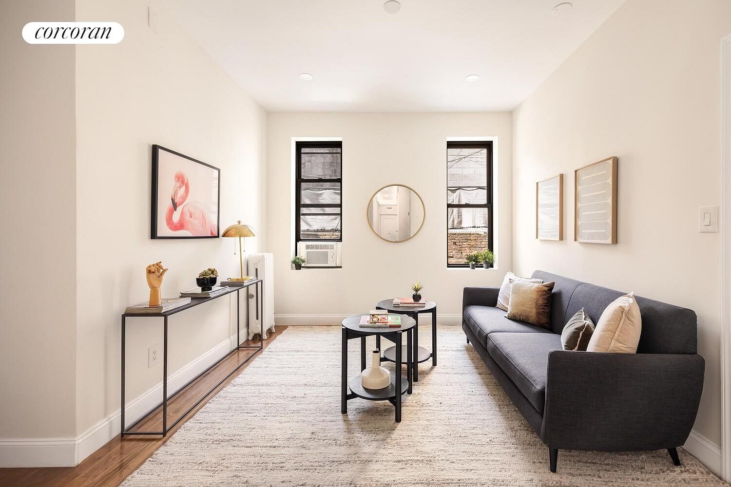 This unit faces the back of the building with a hallway separating the living space from the lobby, eliminating any and all noise. The apartment has been renovated to perfection in classic Brooklyn style. Enjoy hardwood floors, solid-core doors with exposed barn-door hardware, great closets, and recessed lighting. The windowed eat-in kitchen features brand-new shaker style white and gray cabinetry, black hex floor tiles with radiant heat, white subway-tiled backsplash, a suite of LG appliances, white quartz countertops, and space for dining. Bathroom is also windowed and includes a stylish combo of white subway wall tiles with gray grout, hexagonal floor tiles, and wood vanities with Carrara marble countertops. Brushed nickel hardware is used throughout, including the kitchen and bath fixtures, in addition to all door-knobs and hinges.