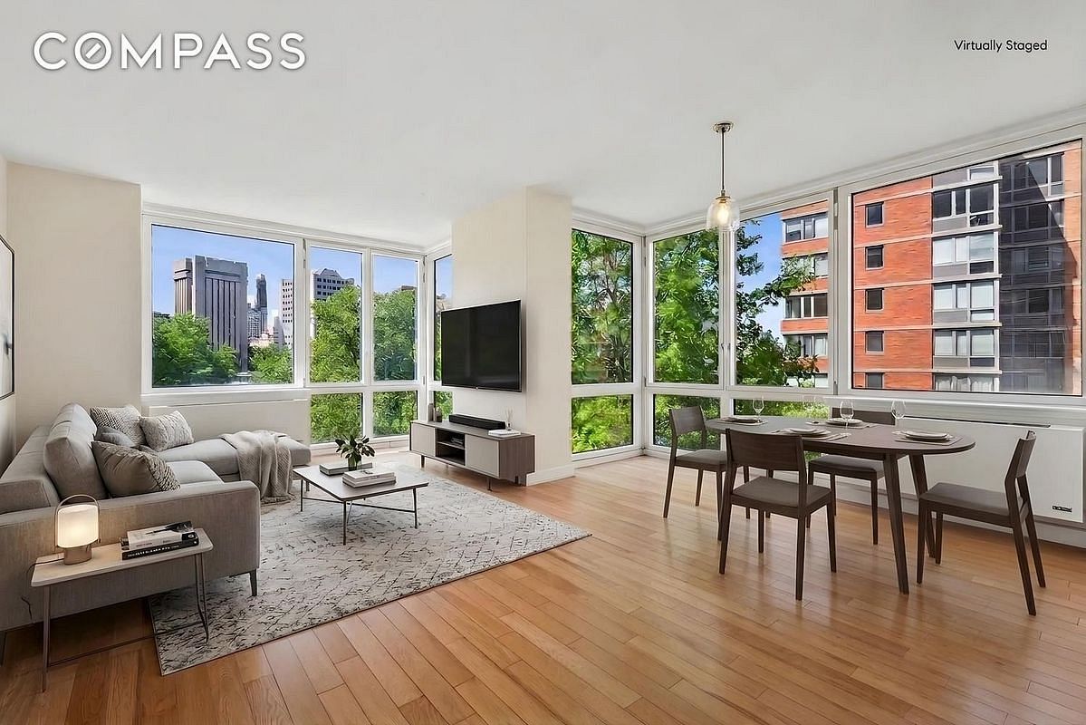 Rare and exquisite corner unit 3 Bedroom | 3 Bathroom 1,433 sqft home with panoramic East River, Manhattan Skyline, and Queensboro Bridge views now available in the Riverwalk Court Condo! Floor-to-ceiling oversized windows with Northwestern and Northeastern exposures enhance the expansiveness of the combined living/dining open-concept layout. The windowed chef's kitchen is fully equipped with premium stainless steel appliances, sleek cabinetry, and granite countertops with bar seatingperfect for casual gatherings or morning coffee with a view. The primary bedroom with river views has an en-suite marble bathroom with a deep soaking tub and a separate shower. The second bedroom can easily fit a King-size bed and also has an en-suite marble bathroom. The third bedroom can fit a Queen-size bed or could be a perfect home office or nursery. In-unit washer/dryer for ultimate convenience and each room is temperature-controlled by the in-wall AC/heating PTAC. In addition to the nine closets, the unit also comes with a storage locker in the basement!