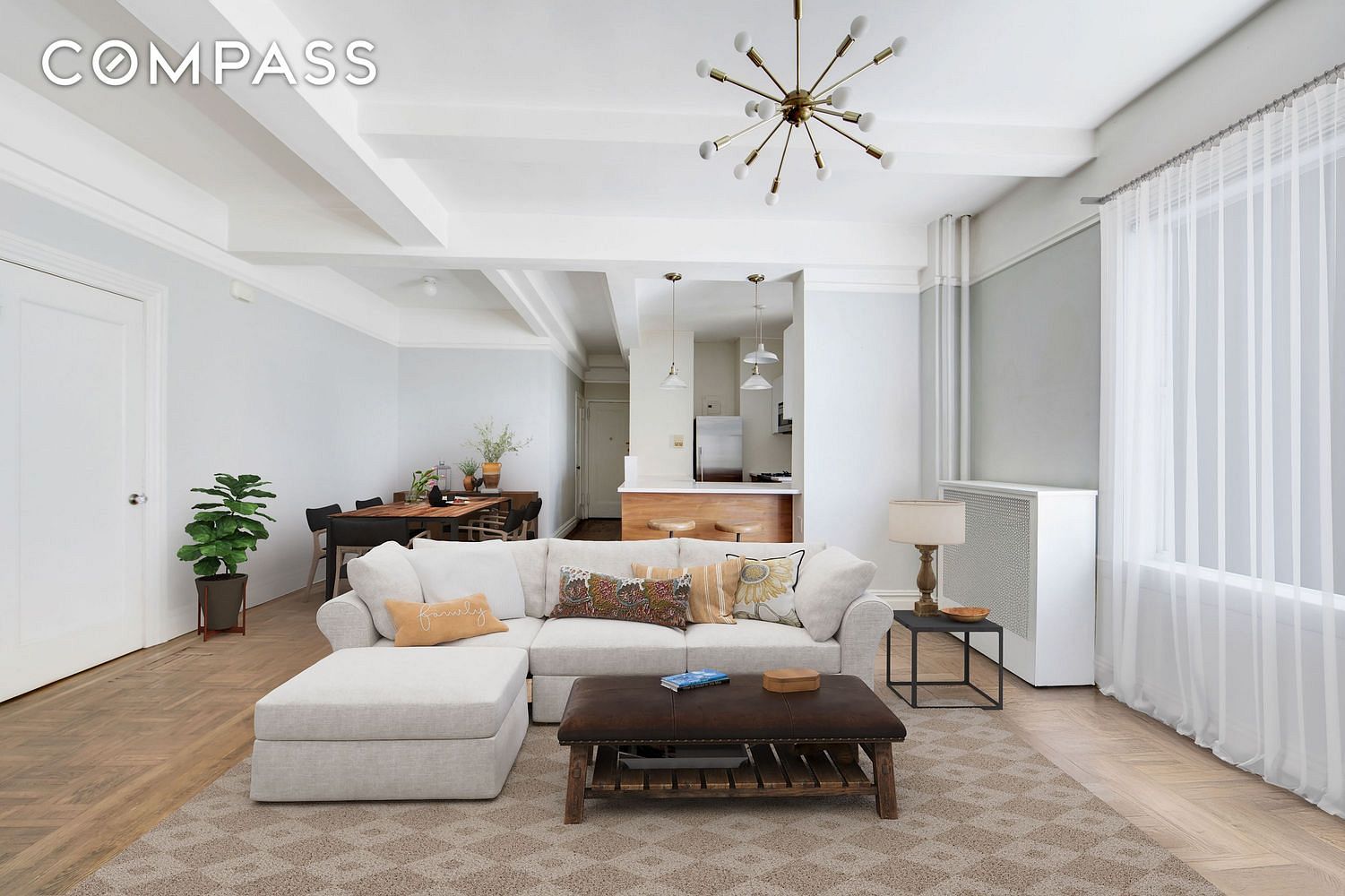 This eighth-floor home features soaring ceilings, oversized windows with sweeping northeast views which includes The Empire State Building. Elegant original details in the apartment pays homage to the buildings storied past. Previously configured as a two-bedroom, the layout has been smartly reimagined to create an expansive open-concept living and dining area thats ideal for entertaining or quiet relaxation.