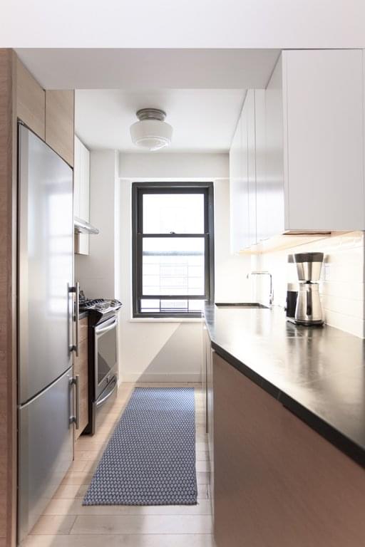 The apartment is renovated and features an open kitchen including a stainless steel gas range, Liebherr refrigeration, paneled Bosch dishwasher, oversized sink, dual-colored custom cabinetry (white uppers, oak lowers), subway tile backsplash and soapstone countertops.