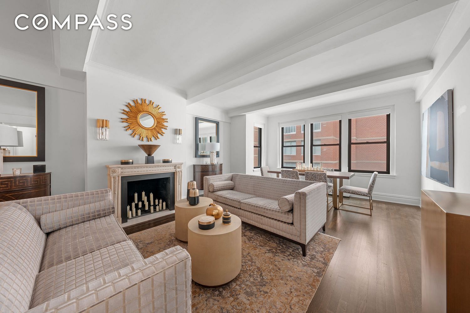 Upon entry, a gracious formal foyer sets an elegant tone and leads into an expansive open-concept living and dining area. A working fireplace serves as a charming and functional focal point, adding both warmth and ambiance. The oversized layout easily accommodates multiple seating areas and a full dining setupideal for entertaining or quiet evenings at home. Electric blinds throughout the apartment add sleek functionality and modern convenience.