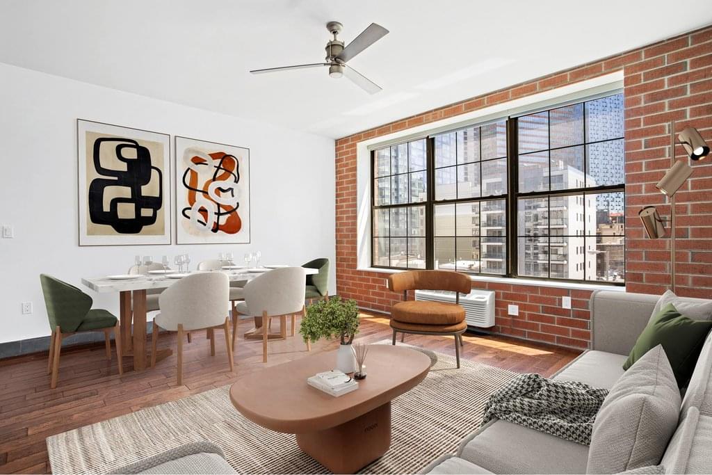 The Factory House is a 10-story, 33-unit condominium. The building's design pays homage to LIC's manufacturing legacy with a sleek warehouse feel and revives a level of historic architectural detail often lost in new construction. Natural light floods through the lobby's double-height vaulted ceilings and floor-to-ceiling windows to illuminate rustic porcelain tile, red brick walls and sculptural steel beams. A dramatic mezzanine overlooks the lobby, a prime perch to admire the uniquely textured flooring and the ceiling's wooden joists. The Factory House provides residents with a full range of amenities including, personal and bicycle storage, a fitness center, playroom, a library lounge and a landscaped resident terrace.