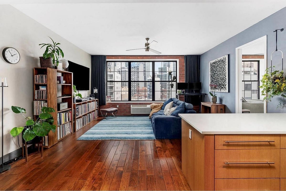 This expansive 1,191-square-foot residence features an open-concept kitchen that flows effortlessly into a spacious living and dining area-entertaining guests or simply enjoying everyday comfort. A modern wall, blending rustic charm with industrial flair, adds a striking design element, complemented by custom blackout curtains for added privacy and ambiance. This space harmoniously connects to a beautifully framed, oversized east-facing window, offering sweeping views of Long Island City.