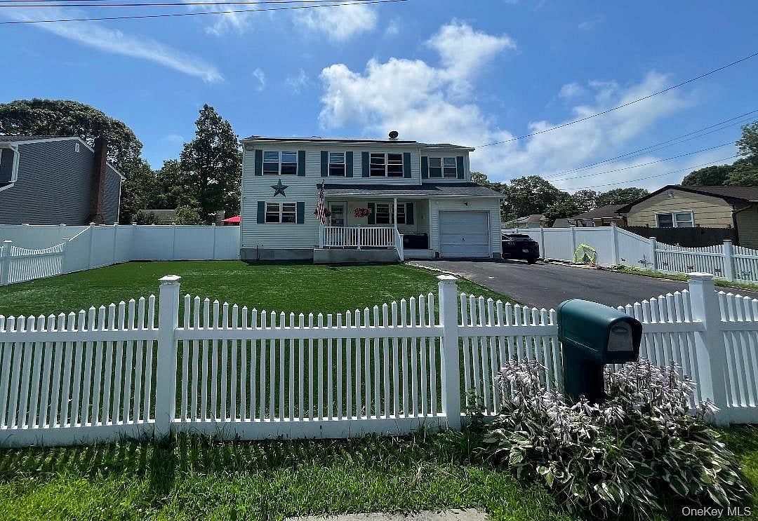 Looking for a spacious and versatile colonial with room for everyone? This beautiful home sits behind a white picket fence on a manicured lot with waterless turf grass and a gated driveway that keeps cars safe. A covered front porch welcomes you, while a fully white PVC fenced yard provides both privacy and charm, helping to keep pets secure on the property. Step inside to a generous first level featuring a spacious eat-in kitchen with wood cabinets, Open kitchen that flows into the den and living room. The den and living room boasts a wood-burning fireplace, vaulted ceiling with a skylight, and sliding glass doors leading to a 10' x 18' rear deck—perfect for entertaining. Also on this floor, you’ll find a convenient half bath, a formal dining area, and a versatile playroom that can serve as a guest area or office, offering extra space for hosting gatherings. The second floor showcases a spacious primary suite complete with a walk-in closet, a full en-suite bath, and its own private office or sitting area. Enjoy peaceful mornings or evenings on the 8' x 10' private upper deck off the primary bedroom. Three additional bedrooms are also on this level, including one with its own 4' x 6' upper deck, along with a shared full bathroom. The fully finished basement offers a legal living space with a large recreation room, a possible fifth bedroom, a full bathroom, a kitchenette, a utility room, and a private outside entrance—ideal for guests. Step into the backyard retreat designed for summer enjoyment, featuring a solar-heated 16' x 32' inground pool, PVC fencing, a spacious patio, pergola, grill area, and a separate section perfect for outdoor entertainment or relaxation. Additional highlights include a 34-panel 10.2 kW leased solar system, split A/C units, professionally installed eight camera system DVR with one terabyte for storage, a private driveway that provides additional parking, an in-ground sprinkler system for the backyard, and a newly installed roof with warranty. Conveniently located within a short walk to the bus and shops, and just minutes from the train, state parks, historical museums, beaches, and the Fire Island National Seashore, this home offers the perfect blend of comfort, functionality, and outdoor living. Ready for your next chapter? With a little care, you can make this home your own.
