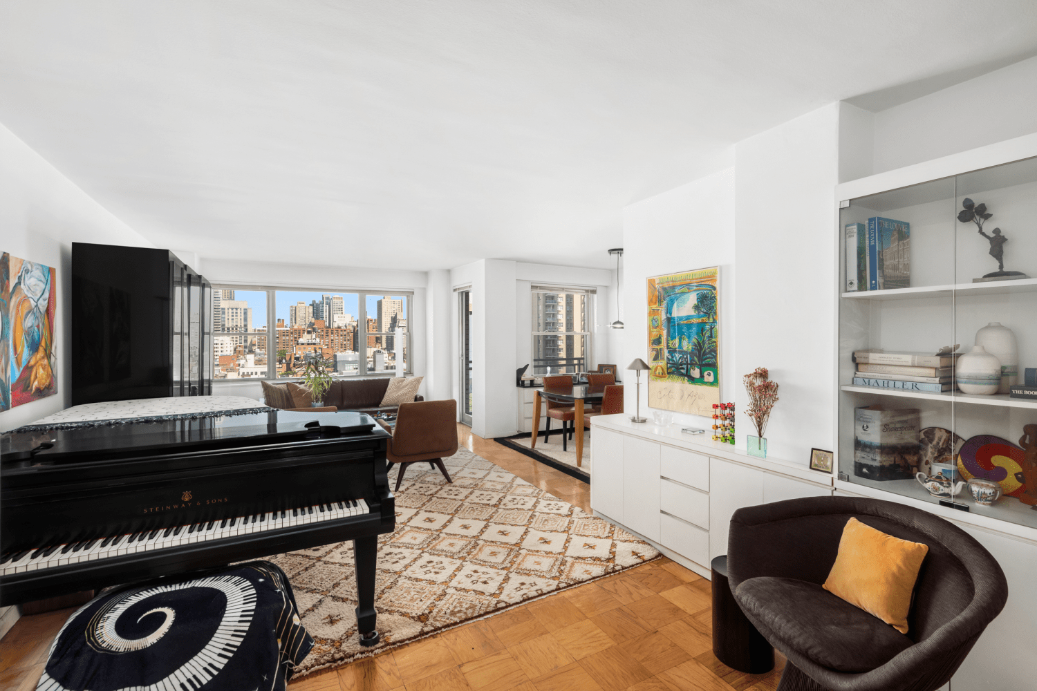 This spacious 14th floor, split 2-bedroom, 2-bathroom apartment with an oversized balcony in a full-service luxury co-op on the Upper East Side offers flexible living space and significant potential to become your ideal home. The large dining alcove adjacent to the living room can easily be converted into a third bedroom if desired. Meticulously maintained by its longtime owner, the apartment provides an excellent opportunity for customization to suit your personal taste.