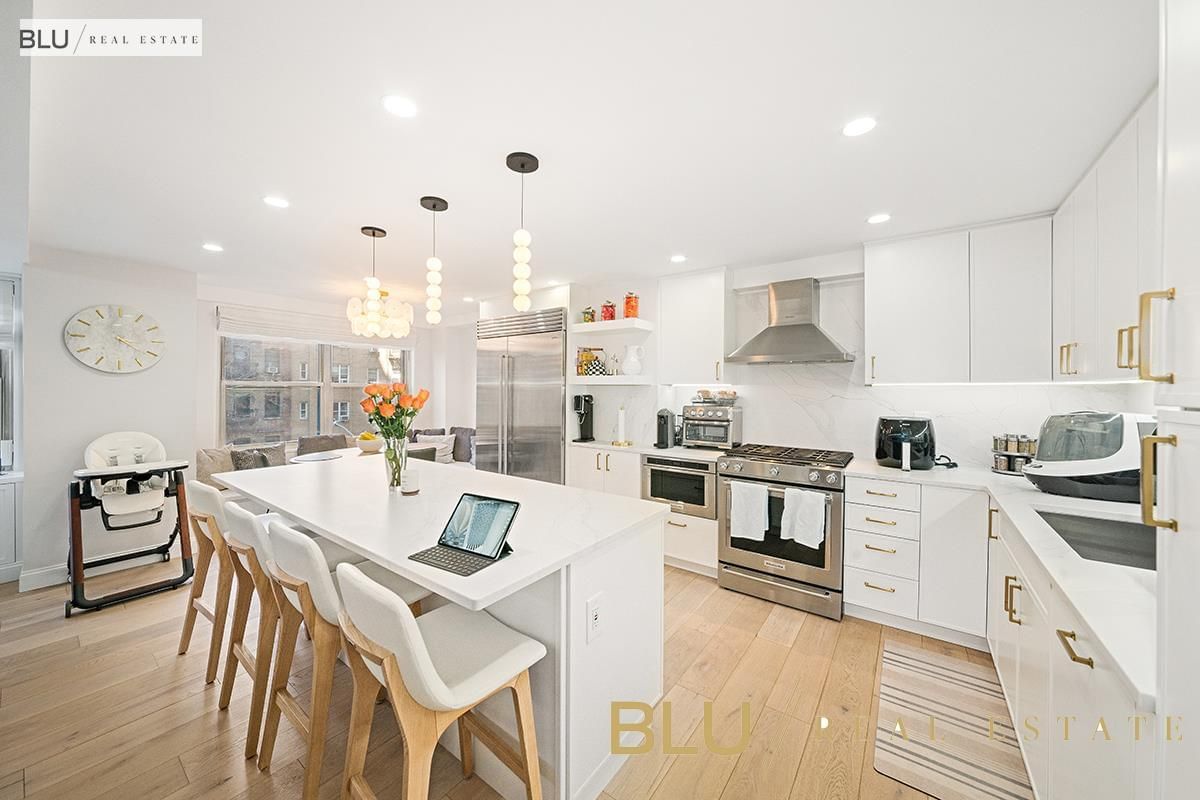 Eat-in, open kitchen with custom banquette seating, 7-foot long island with room for at least 4 counter stools, and all new appliances, including a side-by-side 48 Subzero fridge/freezer, KitchenAid range, and Bosch Benchmark dishwasher. The Ultracraft custom cabinets have a 100 year warranty.