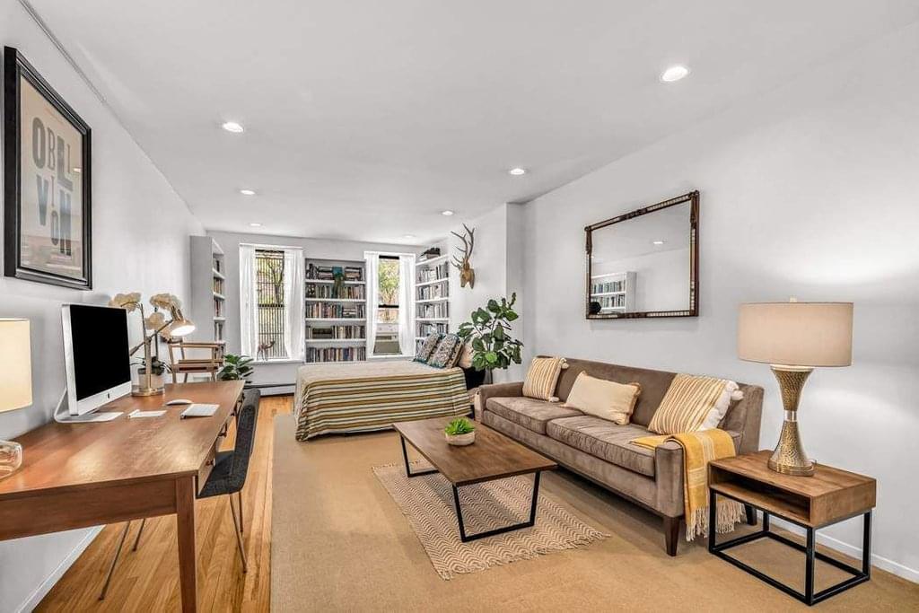 This LG studio apartment, which lives like a one bedroom, in an elevator building called the Adelaide in the heart of Hells Kitchen boasts a spacious layout, beautiful hardwood floors, build-in bookcases, oversized kitchen, recessed lighting, dressing area/office and generous closet space. The large main room which allows a plenitude of light from 2 sizable windows that face a lovely tree-lined street can easily accommodate three separate living areas; dining, living and sleeping. Excellent location in exciting Hells Kitchen, the Adelaide is a well-kept co-op with elevator, video intercom, onsite laundry and recently renovated hallways. Conveniently located near Broadway theaters, amazing restaurants, shopping, the Hudson River Park, subways and buses. Cooperative allows subletting, pets, co-purchasing and pied-a-terres with board approval.