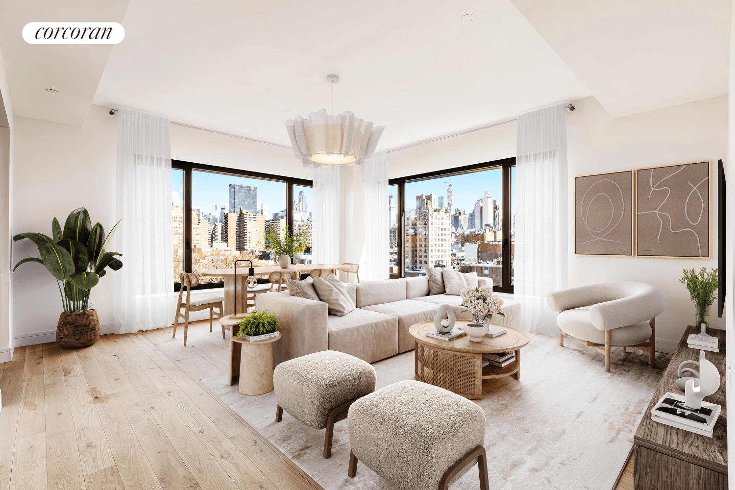 North, south and east-facing with Empire State Building and stunning skyline views, Residence 10B is a 2-bedroom/2-bathroom home spanning 1,268 square feet. This modern home is meticulously detailed with beautiful interiors by BKSK including 5.5-inch-wide plank white oak flooring and 10" ceiling heights. The kitchen has Miele appliances including induction cooktops and 18" wine cooler, Krion countertops with integrated sinks, Kohler fixtures, decorative tile backsplashes with space saving Hafele railing systems, and custom oak veneered and matte lacquer cabinetry.