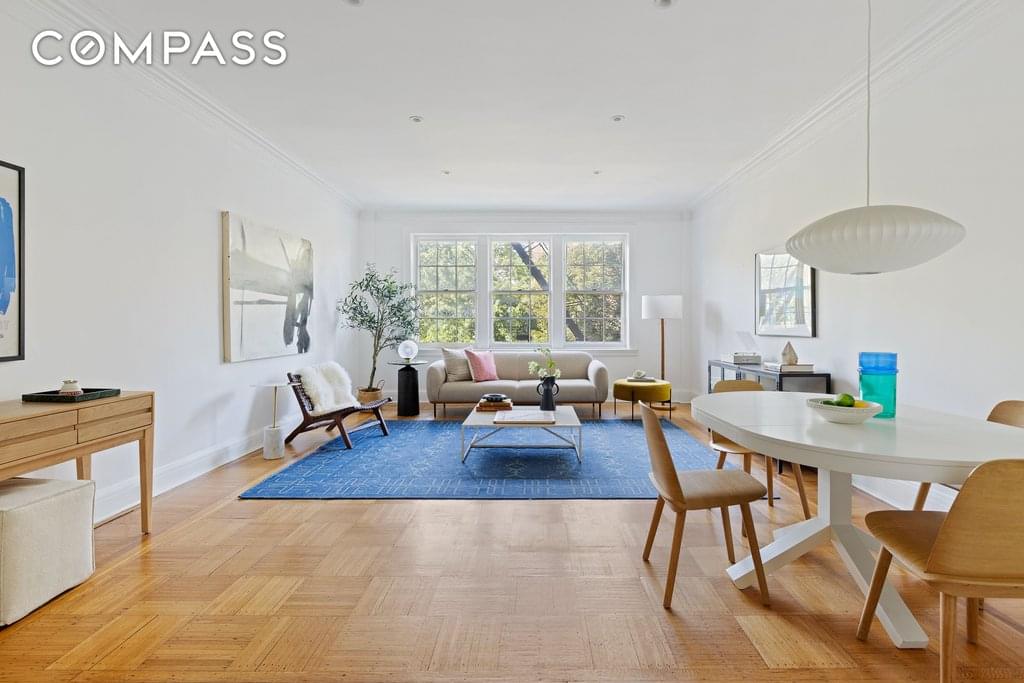 As you proceed into the apartment through a rounded archway, you will be greeted by a massive living room and additional dining area, perfect for entertaining guests or relaxing with loved ones. The large windows allow sunlight to stream in, highlighting the beautiful hardwood floors and enhancing the spaciousness of the room.