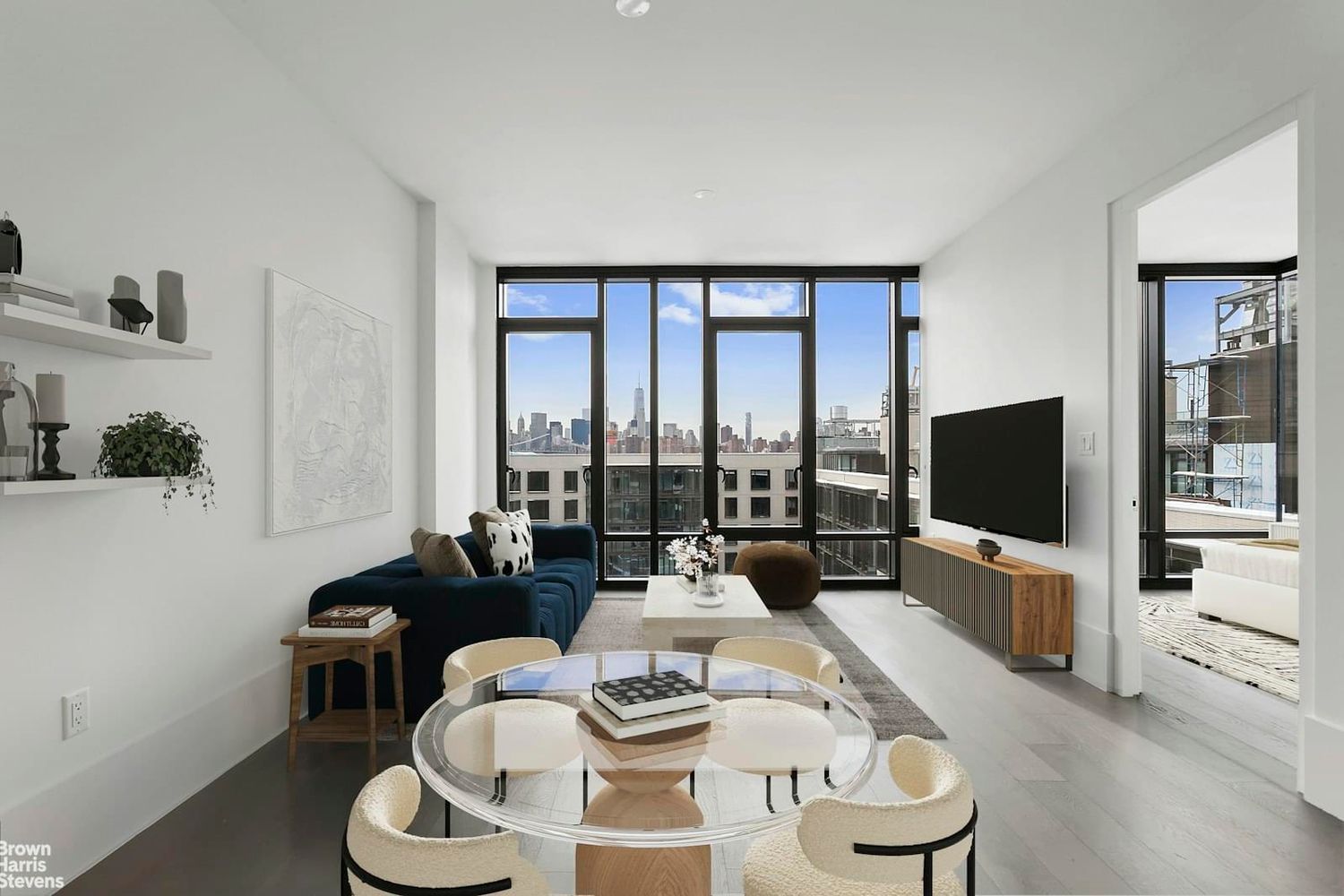 Unit features include floor-to-ceiling windows, beautifully stained white oak floors, generous storage throughout, views of the South Williamsburg waterfront and New York City Skyline with an abundance of natural light and gorgeous sunset lit evenings. In the kitchen you'll find custom cabinetry and marble countertops, Smeg stainless steel appliances, including a full sized refrigerator, oven and cooktop, an externally vented exhaust system and dishwasher. The spacious bathroom has a deep soaking tub with custom fixtures and finishes throughout and your in-unit washer and dryer and zoned central heating and AC add to the comfort and convenience this unit provides.