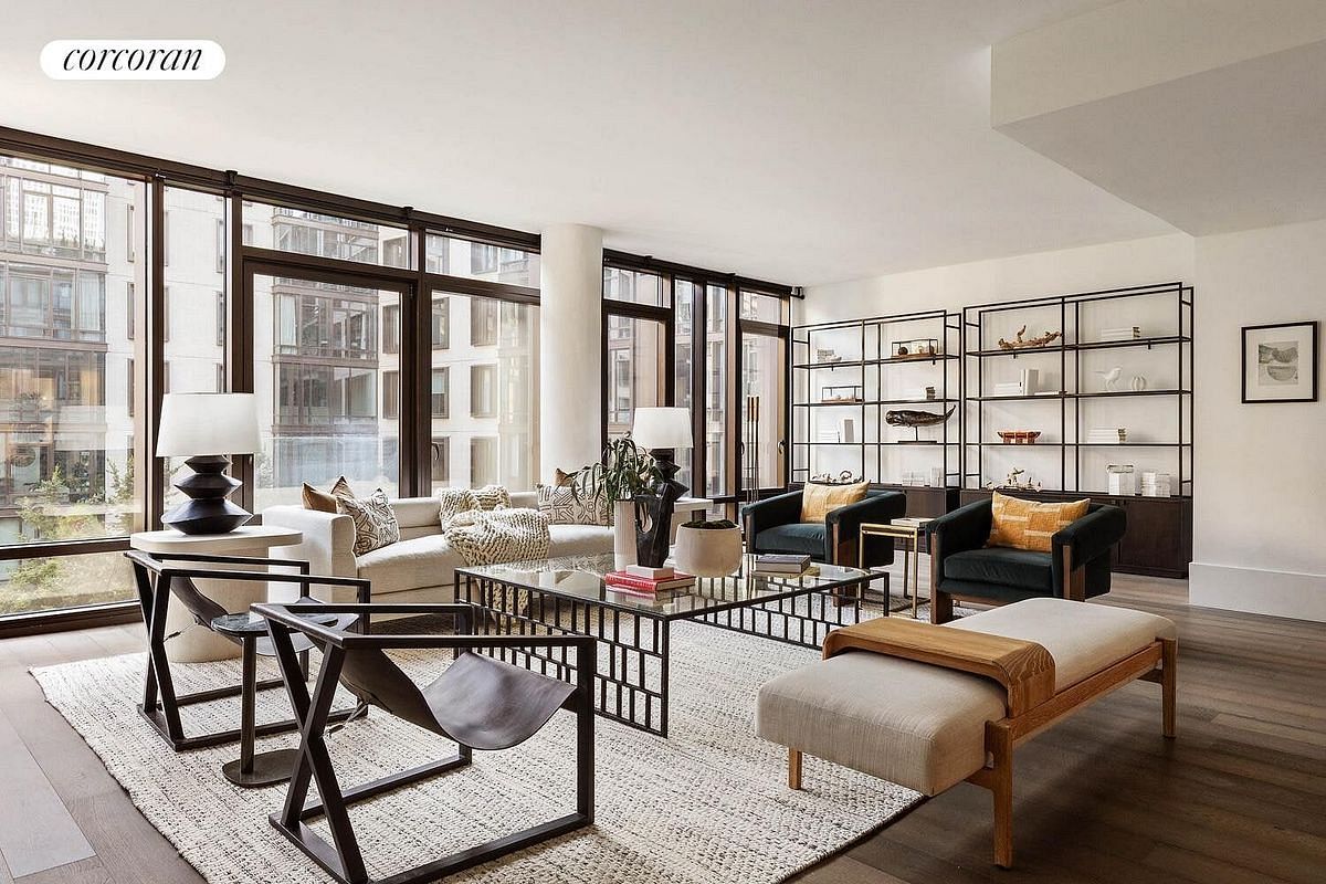 Step into an expansive great room that feels both intimate and infinite - framed by striking floor-to-ceiling gunmetal windows and graced with Northern and Southern exposures. Wide-plank oak floors lend warmth underfoot, setting the stage for unforgettable evenings and relaxed, soulful living.